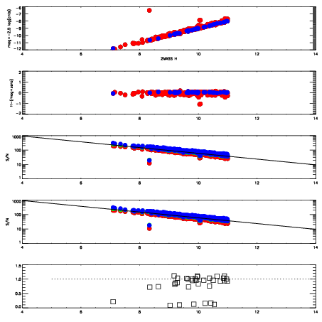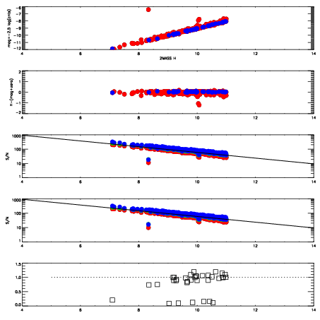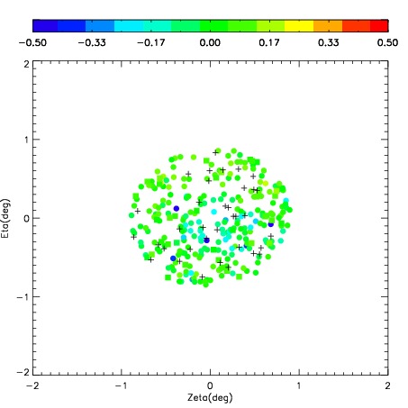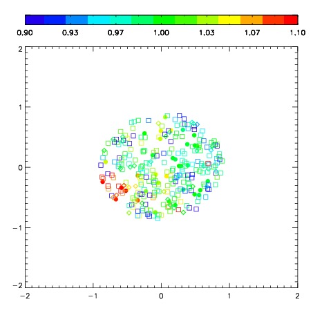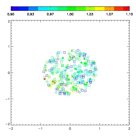 First spatial plots: circles are objects, squares are tellurics, crosses are sky fibers. Colors give deviation of observed mag from expected 2MASS mag using the median zeropoint; red is brighter