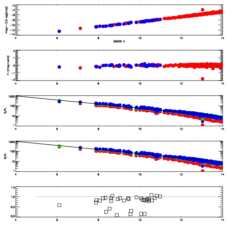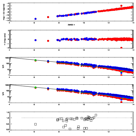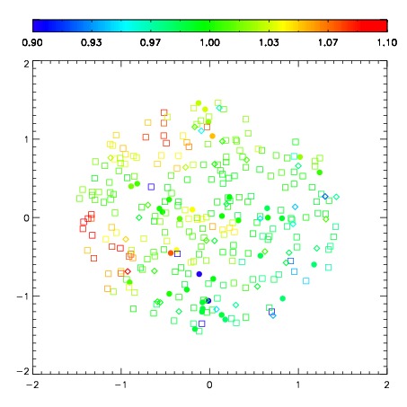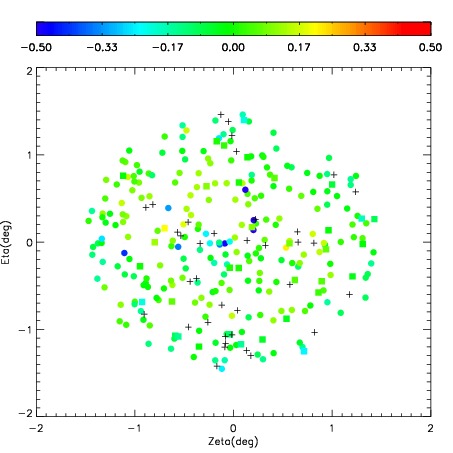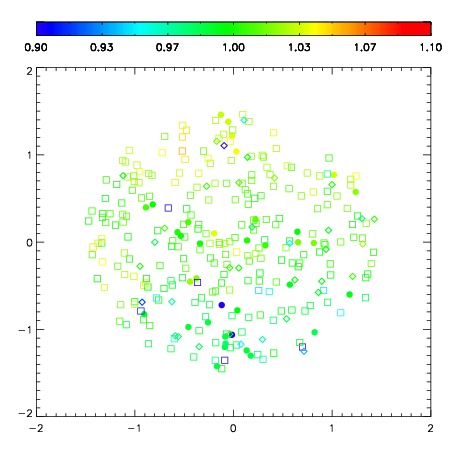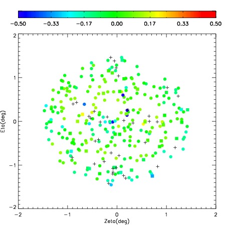 First spatial plots: circles are objects, squares are tellurics, crosses are sky fibers. Colors give deviation of observed mag from expected 2MASS mag using the median zeropoint; red is brighter