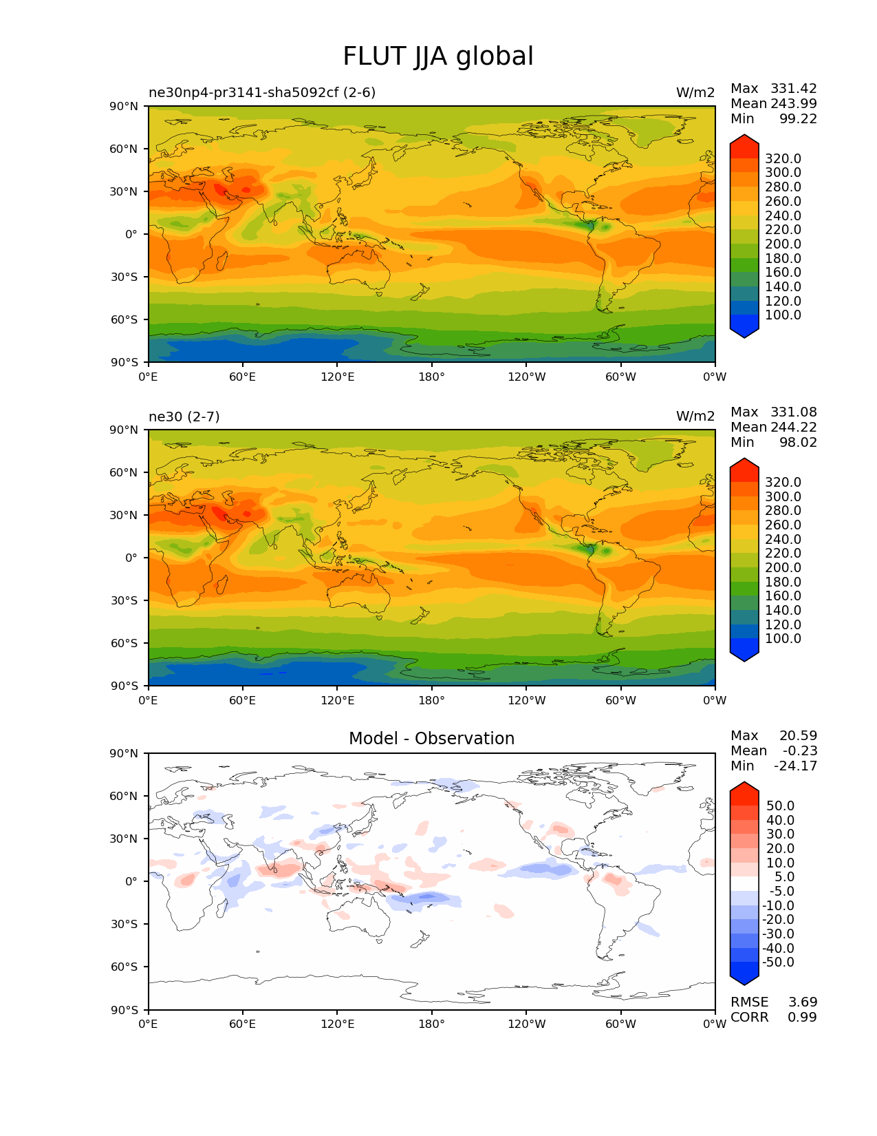Use this command to recreate this image: | e3sm_diags --no_viewer --results_dir '/global/project/projectdirs/acme/www/ambrad/pg-ne30np4-pr3141-sha5092cf' --variables 'FLUT' --diff_colormap 'diverging_bwr.rgb' --contour_levels '100' '120' '140' '160' '180' '200' '220' '240' '260' '280' '300' '320' --diff_levels '-50' '-40' '-30' '-20' '-10' '-5' '5' '10' '20' '30' '40' '50' --test_colormap 'cet_rainbow.rgb' --backend 'mpl' --canvas_size_h '1628' --reference_colormap 'cet_rainbow.rgb' --reference_data_path '/global/cscratch1/sd/ambradl/acme_scratch/cori-knl/diags1/ne30' --main_title 'FLUT JJA global' --test_data_path '/global/cscratch1/sd/ambradl/acme_scratch/cori-knl/diags1/ne30np4-pr3141-sha5092cf' --regions 'global' --regrid_method 'conservative' --figsize '8.5' '11.0' --canvas_size_w '1212' --run_type 'model_vs_model' --regrid_tool 'esmf' --num_workers '4' --reference_name 'ne30' --output_format 'png' --case_id 'model_vs_model' --granulate 'variables' 'seasons' 'regions' 'plevs' --test_name 'ne30np4-pr3141-sha5092cf' --seasons 'JJA' --arrows --selectors 'sets' 'seasons' --diff_title 'Model - Observation' --sets 'lat_lon' --dpi '150' |