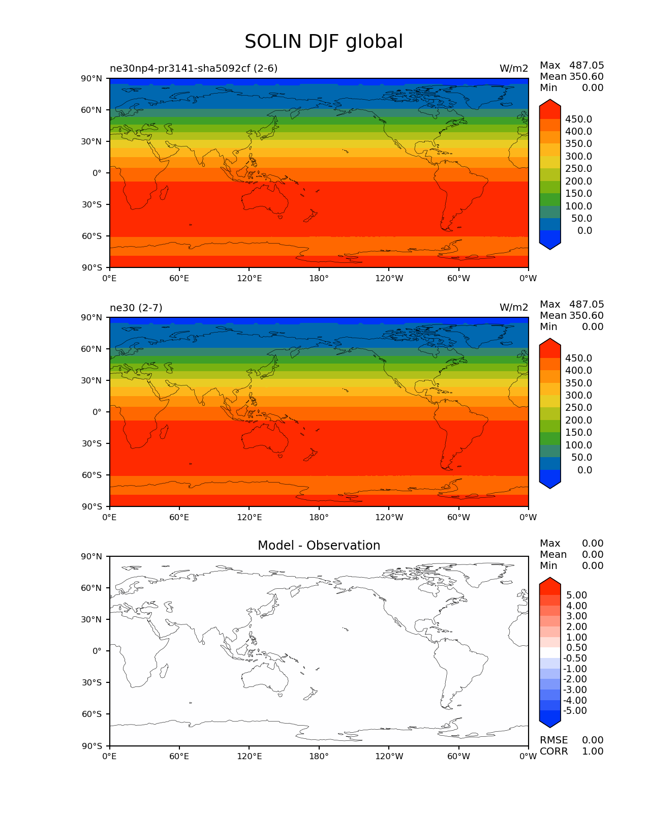 Use this command to recreate this image: | e3sm_diags --no_viewer --results_dir '/global/project/projectdirs/acme/www/ambrad/pg-ne30np4-pr3141-sha5092cf' --variables 'SOLIN' --diff_colormap 'diverging_bwr.rgb' --contour_levels '0' '50' '100' '150' '200' '250' '300' '350' '400' '450' --diff_levels '-5' '-4' '-3' '-2' '-1' '-0.5' '0.5' '1' '2' '3' '4' '5' --test_colormap 'cet_rainbow.rgb' --backend 'mpl' --canvas_size_h '1628' --reference_colormap 'cet_rainbow.rgb' --reference_data_path '/global/cscratch1/sd/ambradl/acme_scratch/cori-knl/diags1/ne30' --main_title 'SOLIN DJF global' --test_data_path '/global/cscratch1/sd/ambradl/acme_scratch/cori-knl/diags1/ne30np4-pr3141-sha5092cf' --regions 'global' --regrid_method 'conservative' --figsize '8.5' '11.0' --canvas_size_w '1212' --run_type 'model_vs_model' --regrid_tool 'esmf' --num_workers '4' --reference_name 'ne30' --output_format 'png' --case_id 'model_vs_model' --granulate 'variables' 'seasons' 'regions' 'plevs' --test_name 'ne30np4-pr3141-sha5092cf' --seasons 'DJF' --arrows --selectors 'sets' 'seasons' --diff_title 'Model - Observation' --sets 'lat_lon' --dpi '150' |