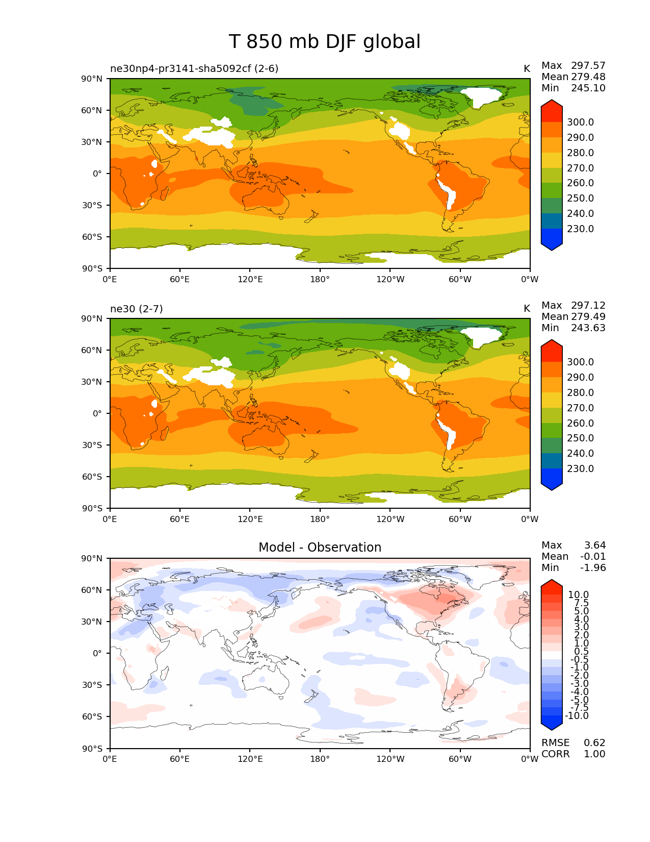 Use this command to recreate this image: | e3sm_diags --no_viewer --results_dir '/global/project/projectdirs/acme/www/ambrad/pg-ne30np4-pr3141-sha5092cf' --variables 'T' --diff_colormap 'diverging_bwr.rgb' --contour_levels '230' '240' '250' '260' '270' '280' '290' '300' --diff_levels '-10' '-7.5' '-5' '-4' '-3' '-2' '-1' '-0.5' '0.5' '1' '2' '3' '4' '5' '7.5' '10' --test_colormap 'cet_rainbow.rgb' --backend 'mpl' --canvas_size_h '1628' --reference_colormap 'cet_rainbow.rgb' --reference_data_path '/global/cscratch1/sd/ambradl/acme_scratch/cori-knl/diags1/ne30' --main_title 'T 850 mb DJF global' --test_data_path '/global/cscratch1/sd/ambradl/acme_scratch/cori-knl/diags1/ne30np4-pr3141-sha5092cf' --regions 'global' --regrid_method 'conservative' --figsize '8.5' '11.0' --canvas_size_w '1212' --run_type 'model_vs_model' --regrid_tool 'esmf' --num_workers '4' --reference_name 'ne30' --output_format 'png' --case_id 'model_vs_model' --granulate 'variables' 'seasons' 'regions' 'plevs' --test_name 'ne30np4-pr3141-sha5092cf' --seasons 'DJF' --arrows --selectors 'sets' 'seasons' --diff_title 'Model - Observation' --sets 'lat_lon' --plevs '850.0' --dpi '150' |