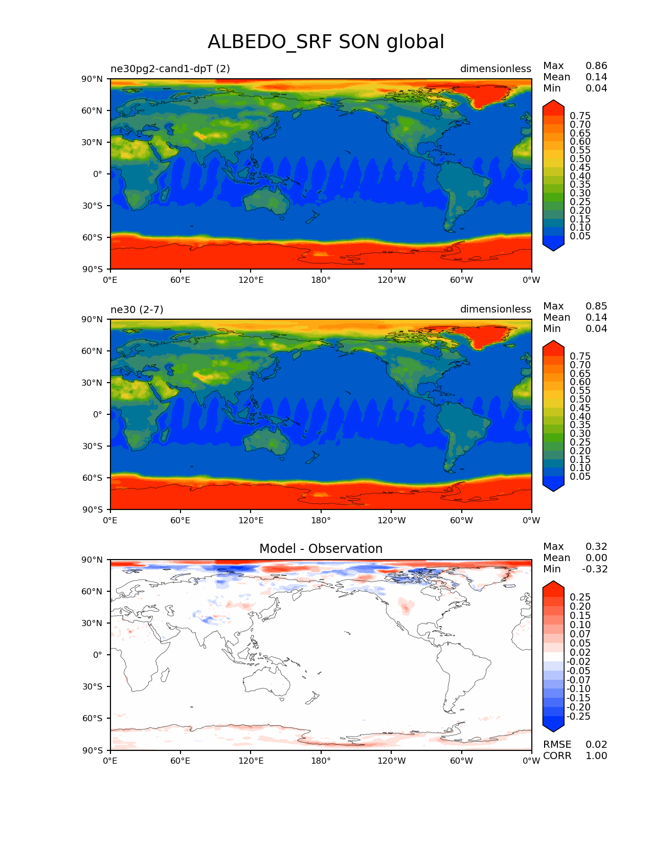 Use this command to recreate this image: | e3sm_diags --no_viewer --results_dir '/global/project/projectdirs/acme/www/ambrad/pg-ne30pg2-cand1-dpT' --variables 'ALBEDO_SRF' --diff_colormap 'diverging_bwr.rgb' --contour_levels '0.05' '0.1' '0.15' '0.2' '0.25' '0.3' '0.35' '0.4' '0.45' '0.5' '0.55' '0.6' '0.65' '0.7' '0.75' --diff_levels '-0.25' '-0.2' '-0.15' '-0.1' '-0.07' '-0.05' '-0.02' '0.02' '0.05' '0.07' '0.1' '0.15' '0.2' '0.25' --test_colormap 'cet_rainbow.rgb' --backend 'mpl' --canvas_size_h '1628' --reference_colormap 'cet_rainbow.rgb' --reference_data_path '/global/cscratch1/sd/ambradl/acme_scratch/cori-knl/diags1/ne30' --main_title 'ALBEDO_SRF SON global' --test_data_path '/global/cscratch1/sd/ambradl/acme_scratch/cori-knl/diags1/ne30pg2-cand1-dpT' --regions 'global' --regrid_method 'conservative' --figsize '8.5' '11.0' --canvas_size_w '1212' --run_type 'model_vs_model' --regrid_tool 'esmf' --num_workers '4' --reference_name 'ne30' --output_format 'png' --case_id 'model_vs_model' --granulate 'variables' 'seasons' 'regions' 'plevs' --test_name 'ne30pg2-cand1-dpT' --seasons 'SON' --arrows --selectors 'sets' 'seasons' --diff_title 'Model - Observation' --sets 'lat_lon' --dpi '150' |