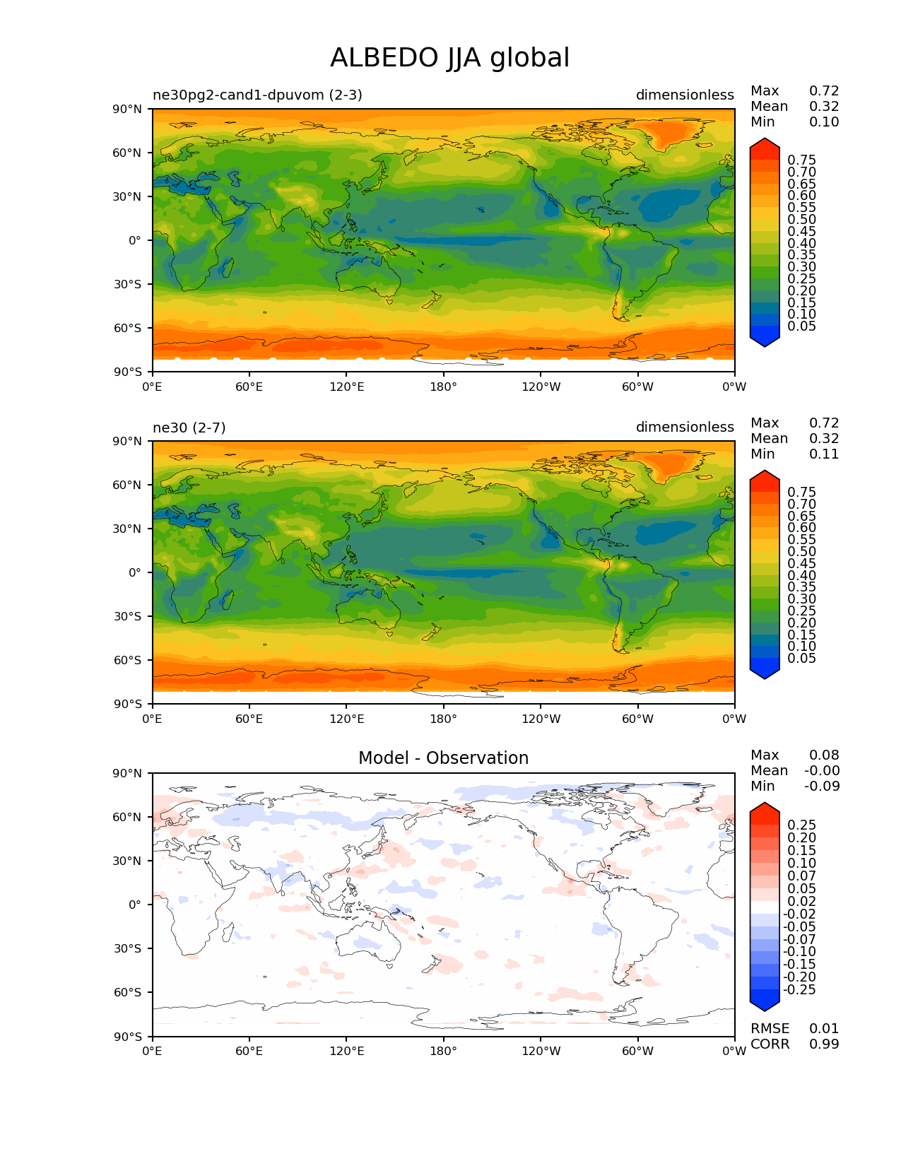 Use this command to recreate this image: | e3sm_diags --no_viewer --results_dir '/global/project/projectdirs/acme/www/ambrad/pg-ne30pg2-cand1-dpuvom' --variables 'ALBEDO' --diff_colormap 'diverging_bwr.rgb' --contour_levels '0.05' '0.1' '0.15' '0.2' '0.25' '0.3' '0.35' '0.4' '0.45' '0.5' '0.55' '0.6' '0.65' '0.7' '0.75' --diff_levels '-0.25' '-0.2' '-0.15' '-0.1' '-0.07' '-0.05' '-0.02' '0.02' '0.05' '0.07' '0.1' '0.15' '0.2' '0.25' --test_colormap 'cet_rainbow.rgb' --backend 'mpl' --canvas_size_h '1628' --reference_colormap 'cet_rainbow.rgb' --reference_data_path '/global/cscratch1/sd/ambradl/acme_scratch/cori-knl/diags1/ne30' --main_title 'ALBEDO JJA global' --test_data_path '/global/cscratch1/sd/ambradl/acme_scratch/cori-knl/diags1/ne30pg2-cand1-dpuvom' --regions 'global' --regrid_method 'conservative' --figsize '8.5' '11.0' --canvas_size_w '1212' --run_type 'model_vs_model' --regrid_tool 'esmf' --num_workers '4' --reference_name 'ne30' --output_format 'png' --case_id 'model_vs_model' --granulate 'variables' 'seasons' 'regions' 'plevs' --test_name 'ne30pg2-cand1-dpuvom' --seasons 'JJA' --arrows --selectors 'sets' 'seasons' --diff_title 'Model - Observation' --sets 'lat_lon' --dpi '150' |
