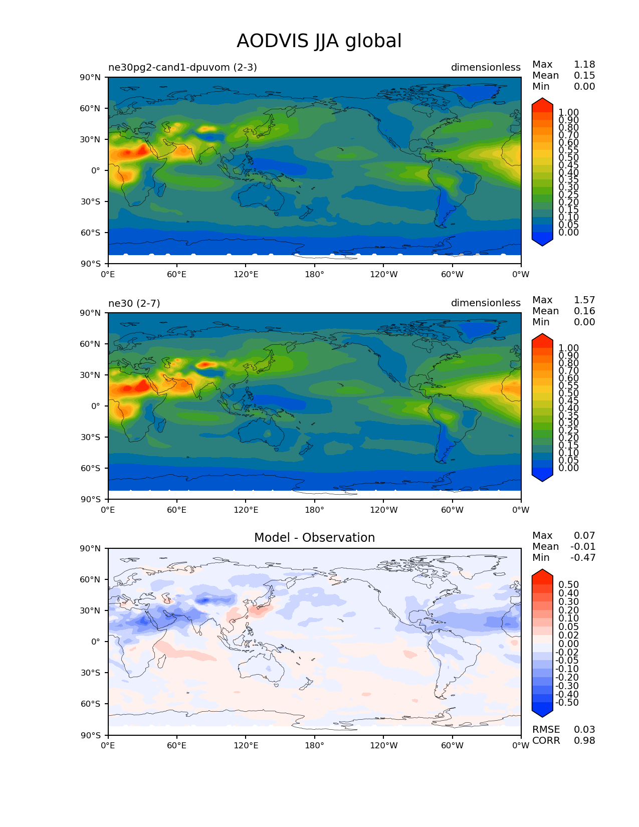 Use this command to recreate this image: | e3sm_diags --no_viewer --results_dir '/global/project/projectdirs/acme/www/ambrad/pg-ne30pg2-cand1-dpuvom' --variables 'AODVIS' --diff_colormap 'diverging_bwr.rgb' --contour_levels '0.0' '0.05' '0.1' '0.15' '0.2' '0.25' '0.3' '0.35' '0.4' '0.45' '0.5' '0.55' '0.6' '0.7' '0.8' '0.9' '1.0' --diff_levels '-0.5' '-0.4' '-0.3' '-0.2' '-0.1' '-0.05' '-0.02' '0' '0.02' '0.05' '0.1' '0.2' '0.3' '0.4' '0.5' --test_colormap 'cet_rainbow.rgb' --backend 'mpl' --canvas_size_h '1628' --reference_colormap 'cet_rainbow.rgb' --reference_data_path '/global/cscratch1/sd/ambradl/acme_scratch/cori-knl/diags1/ne30' --main_title 'AODVIS JJA global' --test_data_path '/global/cscratch1/sd/ambradl/acme_scratch/cori-knl/diags1/ne30pg2-cand1-dpuvom' --regions 'global' --regrid_method 'conservative' --figsize '8.5' '11.0' --canvas_size_w '1212' --run_type 'model_vs_model' --regrid_tool 'esmf' --num_workers '4' --reference_name 'ne30' --output_format 'png' --case_id 'model_vs_model' --granulate 'variables' 'seasons' 'regions' 'plevs' --test_name 'ne30pg2-cand1-dpuvom' --seasons 'JJA' --arrows --selectors 'sets' 'seasons' --diff_title 'Model - Observation' --sets 'lat_lon' --dpi '150' |
