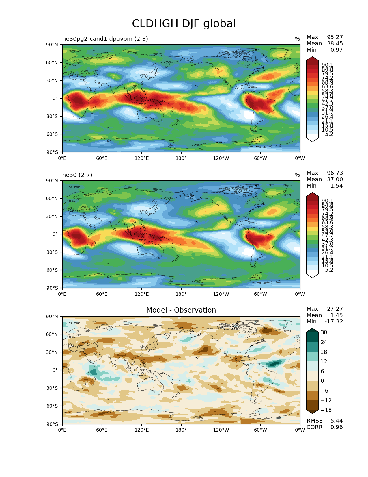 Use this command to recreate this image: | e3sm_diags --no_viewer --results_dir '/global/project/projectdirs/acme/www/ambrad/pg-ne30pg2-cand1-dpuvom' --variables 'CLDHGH' --diff_colormap 'BrBG' --contour_levels '5.18' '10.5' '15.8' '21.1' '26.4' '31.7' '37.0' '42.3' '47.7' '53.0' '58.3' '63.6' '68.9' '74.2' '79.5' '84.8' '90.1' --backend 'mpl' --canvas_size_h '1628' --reference_colormap 'WhiteBlueGreenYellowRed.rgb' --reference_data_path '/global/cscratch1/sd/ambradl/acme_scratch/cori-knl/diags1/ne30' --main_title 'CLDHGH DJF global' --test_data_path '/global/cscratch1/sd/ambradl/acme_scratch/cori-knl/diags1/ne30pg2-cand1-dpuvom' --regions 'global' --test_colormap 'WhiteBlueGreenYellowRed.rgb' --regrid_method 'conservative' --figsize '8.5' '11.0' --canvas_size_w '1212' --run_type 'model_vs_model' --regrid_tool 'esmf' --num_workers '4' --reference_name 'ne30' --output_format 'png' --case_id 'model_vs_model' --granulate 'variables' 'seasons' 'regions' 'plevs' --test_name 'ne30pg2-cand1-dpuvom' --seasons 'DJF' --arrows --selectors 'sets' 'seasons' --diff_title 'Model - Observation' --sets 'lat_lon' --dpi '150' |