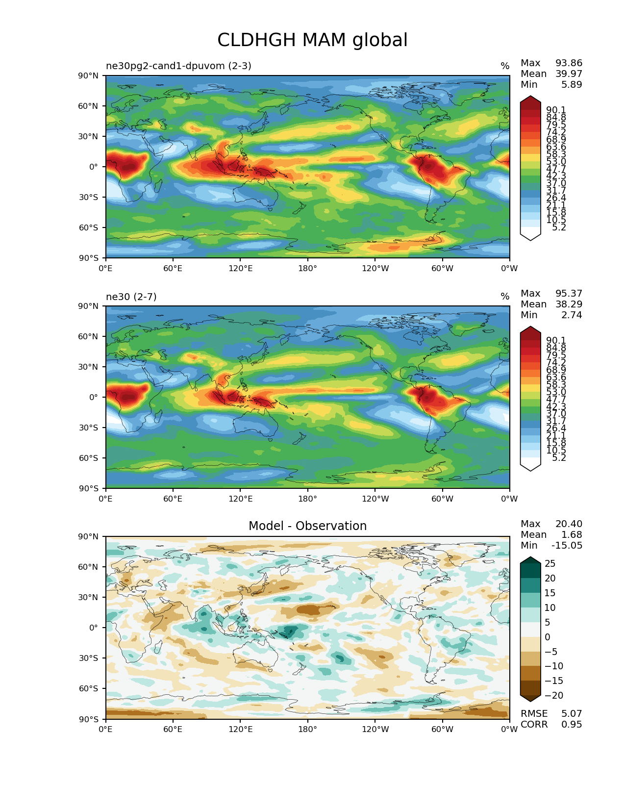 Use this command to recreate this image: | e3sm_diags --no_viewer --results_dir '/global/project/projectdirs/acme/www/ambrad/pg-ne30pg2-cand1-dpuvom' --variables 'CLDHGH' --diff_colormap 'BrBG' --contour_levels '5.18' '10.5' '15.8' '21.1' '26.4' '31.7' '37.0' '42.3' '47.7' '53.0' '58.3' '63.6' '68.9' '74.2' '79.5' '84.8' '90.1' --backend 'mpl' --canvas_size_h '1628' --reference_colormap 'WhiteBlueGreenYellowRed.rgb' --reference_data_path '/global/cscratch1/sd/ambradl/acme_scratch/cori-knl/diags1/ne30' --main_title 'CLDHGH MAM global' --test_data_path '/global/cscratch1/sd/ambradl/acme_scratch/cori-knl/diags1/ne30pg2-cand1-dpuvom' --regions 'global' --test_colormap 'WhiteBlueGreenYellowRed.rgb' --regrid_method 'conservative' --figsize '8.5' '11.0' --canvas_size_w '1212' --run_type 'model_vs_model' --regrid_tool 'esmf' --num_workers '4' --reference_name 'ne30' --output_format 'png' --case_id 'model_vs_model' --granulate 'variables' 'seasons' 'regions' 'plevs' --test_name 'ne30pg2-cand1-dpuvom' --seasons 'MAM' --arrows --selectors 'sets' 'seasons' --diff_title 'Model - Observation' --sets 'lat_lon' --dpi '150' |