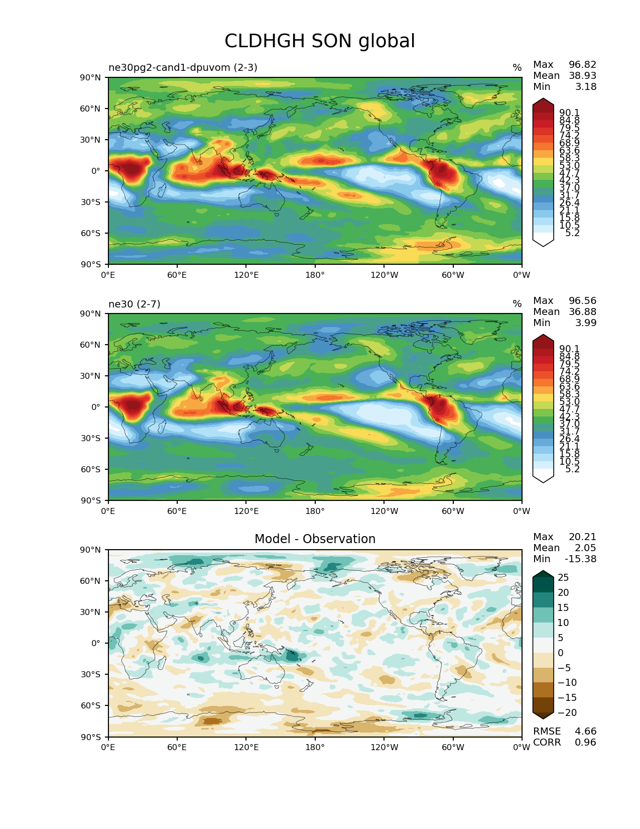 Use this command to recreate this image: | e3sm_diags --no_viewer --results_dir '/global/project/projectdirs/acme/www/ambrad/pg-ne30pg2-cand1-dpuvom' --variables 'CLDHGH' --diff_colormap 'BrBG' --contour_levels '5.18' '10.5' '15.8' '21.1' '26.4' '31.7' '37.0' '42.3' '47.7' '53.0' '58.3' '63.6' '68.9' '74.2' '79.5' '84.8' '90.1' --backend 'mpl' --canvas_size_h '1628' --reference_colormap 'WhiteBlueGreenYellowRed.rgb' --reference_data_path '/global/cscratch1/sd/ambradl/acme_scratch/cori-knl/diags1/ne30' --main_title 'CLDHGH SON global' --test_data_path '/global/cscratch1/sd/ambradl/acme_scratch/cori-knl/diags1/ne30pg2-cand1-dpuvom' --regions 'global' --test_colormap 'WhiteBlueGreenYellowRed.rgb' --regrid_method 'conservative' --figsize '8.5' '11.0' --canvas_size_w '1212' --run_type 'model_vs_model' --regrid_tool 'esmf' --num_workers '4' --reference_name 'ne30' --output_format 'png' --case_id 'model_vs_model' --granulate 'variables' 'seasons' 'regions' 'plevs' --test_name 'ne30pg2-cand1-dpuvom' --seasons 'SON' --arrows --selectors 'sets' 'seasons' --diff_title 'Model - Observation' --sets 'lat_lon' --dpi '150' |