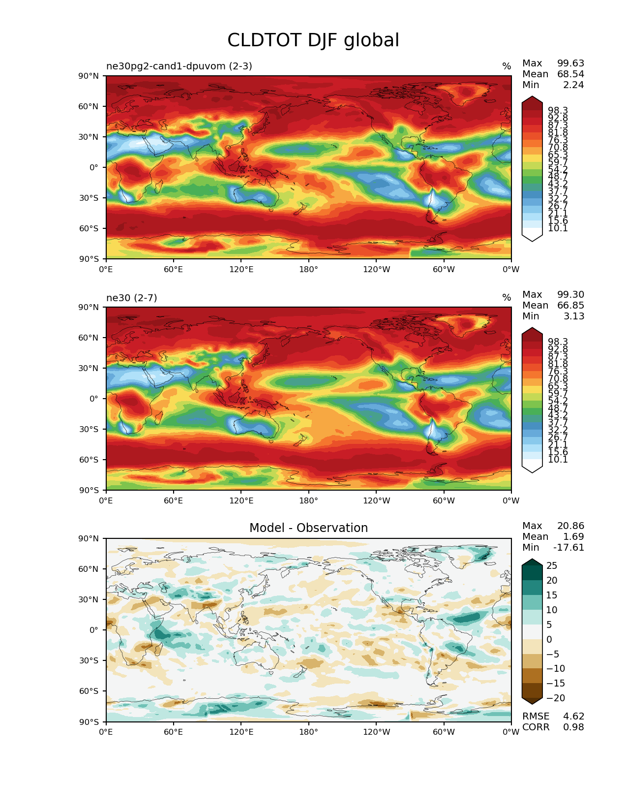 Use this command to recreate this image: | e3sm_diags --no_viewer --results_dir '/global/project/projectdirs/acme/www/ambrad/pg-ne30pg2-cand1-dpuvom' --variables 'CLDTOT' --diff_colormap 'BrBG' --contour_levels '10.1' '15.6' '21.1' '26.7' '32.2' '37.7' '43.2' '48.7' '54.2' '59.7' '65.3' '70.8' '76.3' '81.8' '87.3' '92.8' '98.3' --backend 'mpl' --canvas_size_h '1628' --reference_colormap 'WhiteBlueGreenYellowRed.rgb' --reference_data_path '/global/cscratch1/sd/ambradl/acme_scratch/cori-knl/diags1/ne30' --main_title 'CLDTOT DJF global' --test_data_path '/global/cscratch1/sd/ambradl/acme_scratch/cori-knl/diags1/ne30pg2-cand1-dpuvom' --regions 'global' --test_colormap 'WhiteBlueGreenYellowRed.rgb' --regrid_method 'conservative' --figsize '8.5' '11.0' --canvas_size_w '1212' --run_type 'model_vs_model' --regrid_tool 'esmf' --num_workers '4' --reference_name 'ne30' --output_format 'png' --case_id 'model_vs_model' --granulate 'variables' 'seasons' 'regions' 'plevs' --test_name 'ne30pg2-cand1-dpuvom' --seasons 'DJF' --arrows --selectors 'sets' 'seasons' --diff_title 'Model - Observation' --sets 'lat_lon' --dpi '150' |