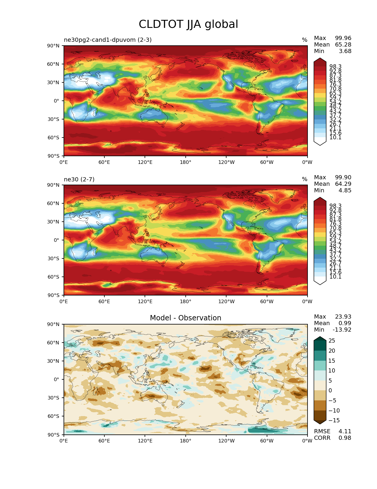 Use this command to recreate this image: | e3sm_diags --no_viewer --results_dir '/global/project/projectdirs/acme/www/ambrad/pg-ne30pg2-cand1-dpuvom' --variables 'CLDTOT' --diff_colormap 'BrBG' --contour_levels '10.1' '15.6' '21.1' '26.7' '32.2' '37.7' '43.2' '48.7' '54.2' '59.7' '65.3' '70.8' '76.3' '81.8' '87.3' '92.8' '98.3' --backend 'mpl' --canvas_size_h '1628' --reference_colormap 'WhiteBlueGreenYellowRed.rgb' --reference_data_path '/global/cscratch1/sd/ambradl/acme_scratch/cori-knl/diags1/ne30' --main_title 'CLDTOT JJA global' --test_data_path '/global/cscratch1/sd/ambradl/acme_scratch/cori-knl/diags1/ne30pg2-cand1-dpuvom' --regions 'global' --test_colormap 'WhiteBlueGreenYellowRed.rgb' --regrid_method 'conservative' --figsize '8.5' '11.0' --canvas_size_w '1212' --run_type 'model_vs_model' --regrid_tool 'esmf' --num_workers '4' --reference_name 'ne30' --output_format 'png' --case_id 'model_vs_model' --granulate 'variables' 'seasons' 'regions' 'plevs' --test_name 'ne30pg2-cand1-dpuvom' --seasons 'JJA' --arrows --selectors 'sets' 'seasons' --diff_title 'Model - Observation' --sets 'lat_lon' --dpi '150' |