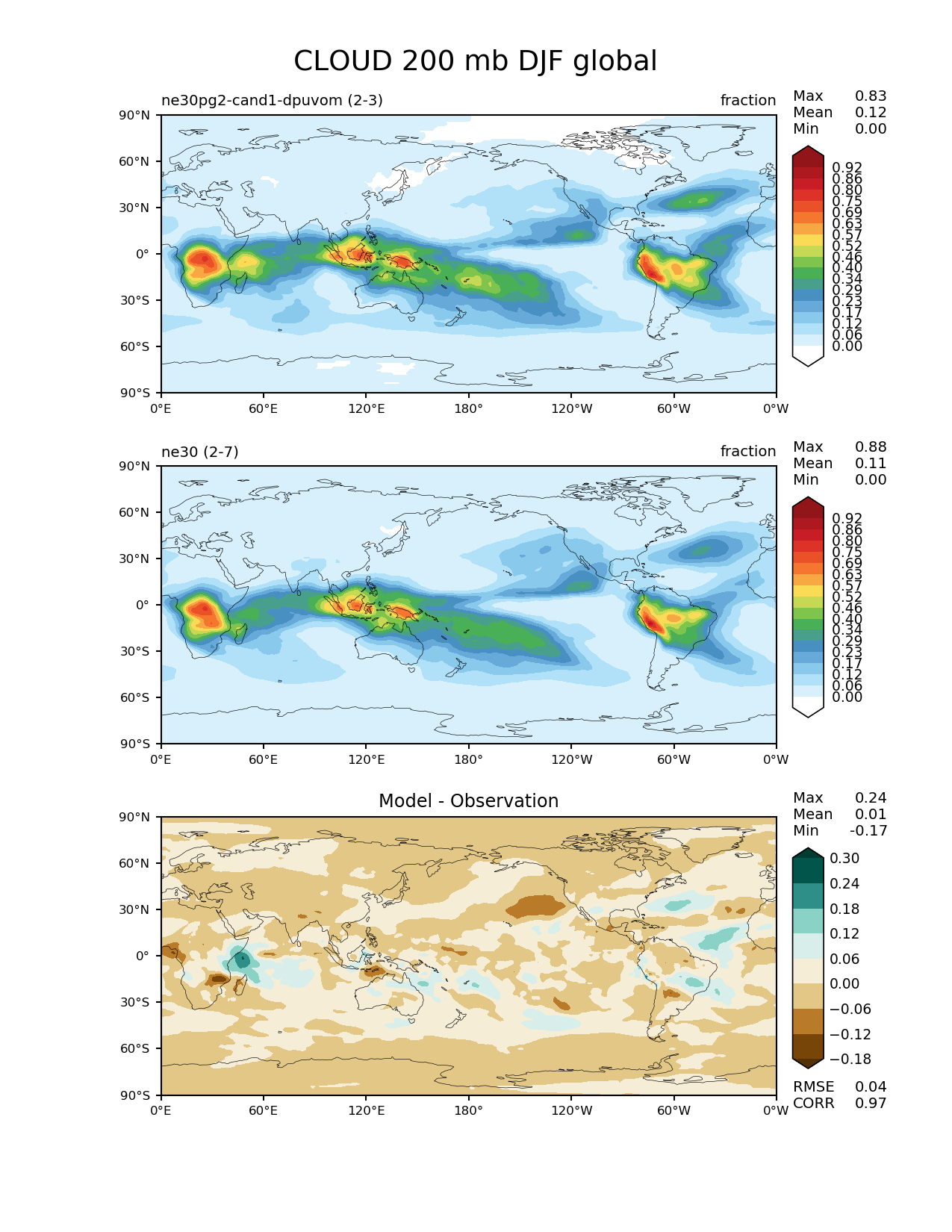 Use this command to recreate this image: | e3sm_diags --no_viewer --results_dir '/global/project/projectdirs/acme/www/ambrad/pg-ne30pg2-cand1-dpuvom' --diff_colormap 'BrBG' --contour_levels '0.0' '0.0574' '0.115' '0.172' '0.23' '0.287' '0.345' '0.402' '0.459' '0.517' '0.574' '0.632' '0.689' '0.747' '0.804' '0.861' '0.919' --backend 'mpl' --canvas_size_h '1628' --reference_colormap 'WhiteBlueGreenYellowRed.rgb' --reference_data_path '/global/cscratch1/sd/ambradl/acme_scratch/cori-knl/diags1/ne30' --main_title 'CLOUD 200 mb DJF global' --test_data_path '/global/cscratch1/sd/ambradl/acme_scratch/cori-knl/diags1/ne30pg2-cand1-dpuvom' --regions 'global' --test_colormap 'WhiteBlueGreenYellowRed.rgb' --regrid_method 'conservative' --variables 'CLOUD' --figsize '8.5' '11.0' --canvas_size_w '1212' --run_type 'model_vs_model' --regrid_tool 'esmf' --num_workers '4' --reference_name 'ne30' --output_format 'png' --case_id 'model_vs_model' --granulate 'variables' 'seasons' 'regions' 'plevs' --test_name 'ne30pg2-cand1-dpuvom' --seasons 'DJF' --arrows --selectors 'sets' 'seasons' --diff_title 'Model - Observation' --sets 'lat_lon' --plevs '200.0' --dpi '150' |