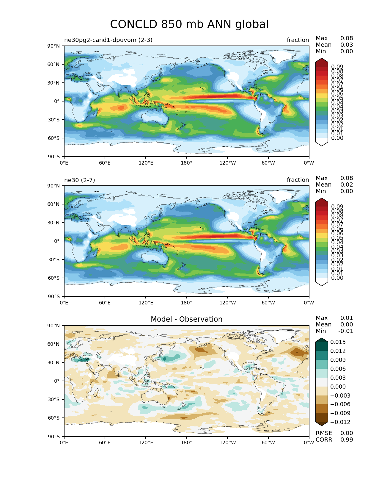 Use this command to recreate this image: | e3sm_diags --no_viewer --results_dir '/global/project/projectdirs/acme/www/ambrad/pg-ne30pg2-cand1-dpuvom' --diff_colormap 'BrBG' --contour_levels '0.0' '0.00557' '0.0111' '0.0167' '0.0223' '0.0279' '0.0334' '0.039' '0.0446' '0.0502' '0.0557' '0.0613' '0.0669' '0.0725' '0.078' '0.0836' '0.0892' --backend 'mpl' --canvas_size_h '1628' --reference_colormap 'WhiteBlueGreenYellowRed.rgb' --reference_data_path '/global/cscratch1/sd/ambradl/acme_scratch/cori-knl/diags1/ne30' --main_title 'CONCLD 850 mb ANN global' --test_data_path '/global/cscratch1/sd/ambradl/acme_scratch/cori-knl/diags1/ne30pg2-cand1-dpuvom' --regions 'global' --test_colormap 'WhiteBlueGreenYellowRed.rgb' --regrid_method 'conservative' --variables 'CONCLD' --figsize '8.5' '11.0' --canvas_size_w '1212' --run_type 'model_vs_model' --regrid_tool 'esmf' --num_workers '4' --reference_name 'ne30' --output_format 'png' --case_id 'model_vs_model' --granulate 'variables' 'seasons' 'regions' 'plevs' --test_name 'ne30pg2-cand1-dpuvom' --seasons 'ANN' --arrows --selectors 'sets' 'seasons' --diff_title 'Model - Observation' --sets 'lat_lon' --plevs '850.0' --dpi '150' |