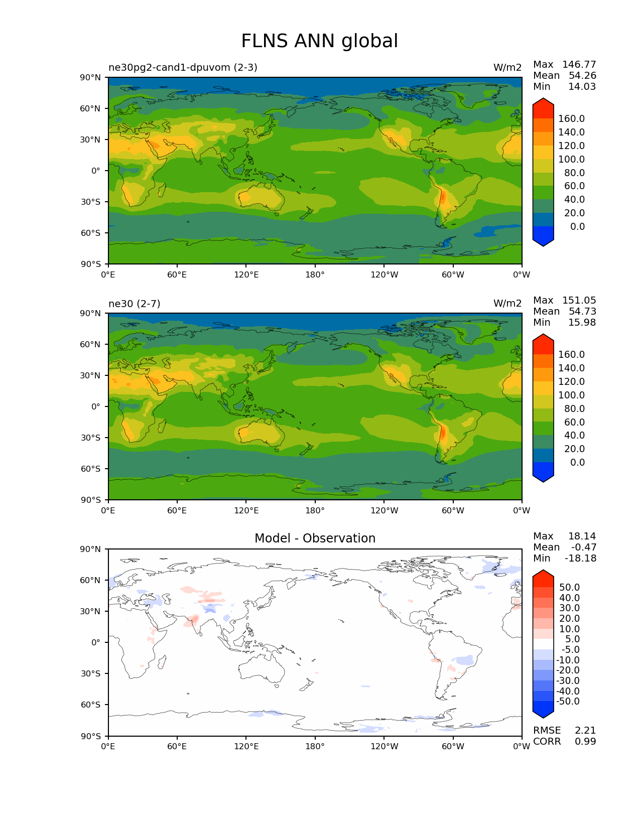 Use this command to recreate this image: | e3sm_diags --no_viewer --results_dir '/global/project/projectdirs/acme/www/ambrad/pg-ne30pg2-cand1-dpuvom' --variables 'FLNS' --diff_colormap 'diverging_bwr.rgb' --contour_levels '0' '20' '40' '60' '80' '100' '120' '140' '160' --diff_levels '-50' '-40' '-30' '-20' '-10' '-5' '5' '10' '20' '30' '40' '50' --test_colormap 'cet_rainbow.rgb' --backend 'mpl' --canvas_size_h '1628' --reference_colormap 'cet_rainbow.rgb' --reference_data_path '/global/cscratch1/sd/ambradl/acme_scratch/cori-knl/diags1/ne30' --main_title 'FLNS ANN global' --test_data_path '/global/cscratch1/sd/ambradl/acme_scratch/cori-knl/diags1/ne30pg2-cand1-dpuvom' --regions 'global' --regrid_method 'conservative' --figsize '8.5' '11.0' --canvas_size_w '1212' --run_type 'model_vs_model' --regrid_tool 'esmf' --num_workers '4' --reference_name 'ne30' --output_format 'png' --case_id 'model_vs_model' --granulate 'variables' 'seasons' 'regions' 'plevs' --test_name 'ne30pg2-cand1-dpuvom' --seasons 'ANN' --arrows --selectors 'sets' 'seasons' --diff_title 'Model - Observation' --sets 'lat_lon' --dpi '150' |