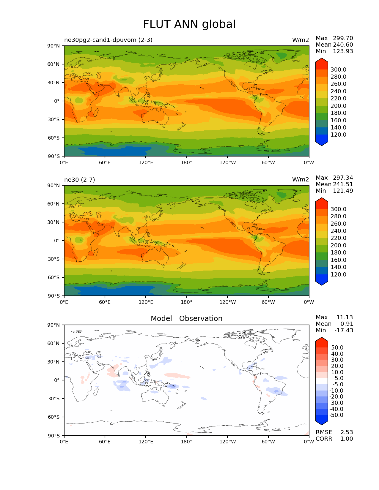 Use this command to recreate this image: | e3sm_diags --no_viewer --results_dir '/global/project/projectdirs/acme/www/ambrad/pg-ne30pg2-cand1-dpuvom' --variables 'FLUT' --diff_colormap 'diverging_bwr.rgb' --contour_levels '120' '140' '160' '180' '200' '220' '240' '260' '280' '300' --diff_levels '-50' '-40' '-30' '-20' '-10' '-5' '5' '10' '20' '30' '40' '50' --test_colormap 'cet_rainbow.rgb' --backend 'mpl' --canvas_size_h '1628' --reference_colormap 'cet_rainbow.rgb' --reference_data_path '/global/cscratch1/sd/ambradl/acme_scratch/cori-knl/diags1/ne30' --main_title 'FLUT ANN global' --test_data_path '/global/cscratch1/sd/ambradl/acme_scratch/cori-knl/diags1/ne30pg2-cand1-dpuvom' --regions 'global' --regrid_method 'conservative' --figsize '8.5' '11.0' --canvas_size_w '1212' --run_type 'model_vs_model' --regrid_tool 'esmf' --num_workers '4' --reference_name 'ne30' --output_format 'png' --case_id 'model_vs_model' --granulate 'variables' 'seasons' 'regions' 'plevs' --test_name 'ne30pg2-cand1-dpuvom' --seasons 'ANN' --arrows --selectors 'sets' 'seasons' --diff_title 'Model - Observation' --sets 'lat_lon' --dpi '150' |
