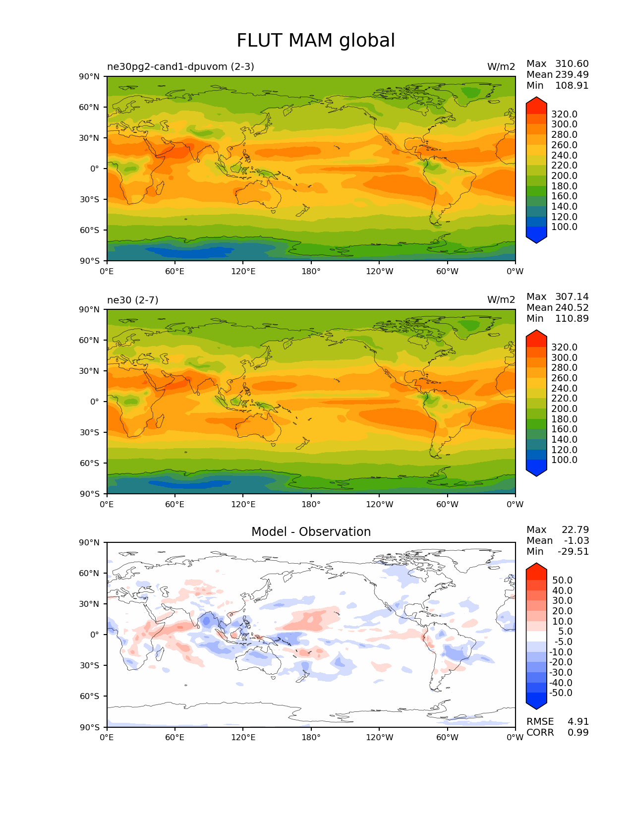 Use this command to recreate this image: | e3sm_diags --no_viewer --results_dir '/global/project/projectdirs/acme/www/ambrad/pg-ne30pg2-cand1-dpuvom' --variables 'FLUT' --diff_colormap 'diverging_bwr.rgb' --contour_levels '100' '120' '140' '160' '180' '200' '220' '240' '260' '280' '300' '320' --diff_levels '-50' '-40' '-30' '-20' '-10' '-5' '5' '10' '20' '30' '40' '50' --test_colormap 'cet_rainbow.rgb' --backend 'mpl' --canvas_size_h '1628' --reference_colormap 'cet_rainbow.rgb' --reference_data_path '/global/cscratch1/sd/ambradl/acme_scratch/cori-knl/diags1/ne30' --main_title 'FLUT MAM global' --test_data_path '/global/cscratch1/sd/ambradl/acme_scratch/cori-knl/diags1/ne30pg2-cand1-dpuvom' --regions 'global' --regrid_method 'conservative' --figsize '8.5' '11.0' --canvas_size_w '1212' --run_type 'model_vs_model' --regrid_tool 'esmf' --num_workers '4' --reference_name 'ne30' --output_format 'png' --case_id 'model_vs_model' --granulate 'variables' 'seasons' 'regions' 'plevs' --test_name 'ne30pg2-cand1-dpuvom' --seasons 'MAM' --arrows --selectors 'sets' 'seasons' --diff_title 'Model - Observation' --sets 'lat_lon' --dpi '150' |