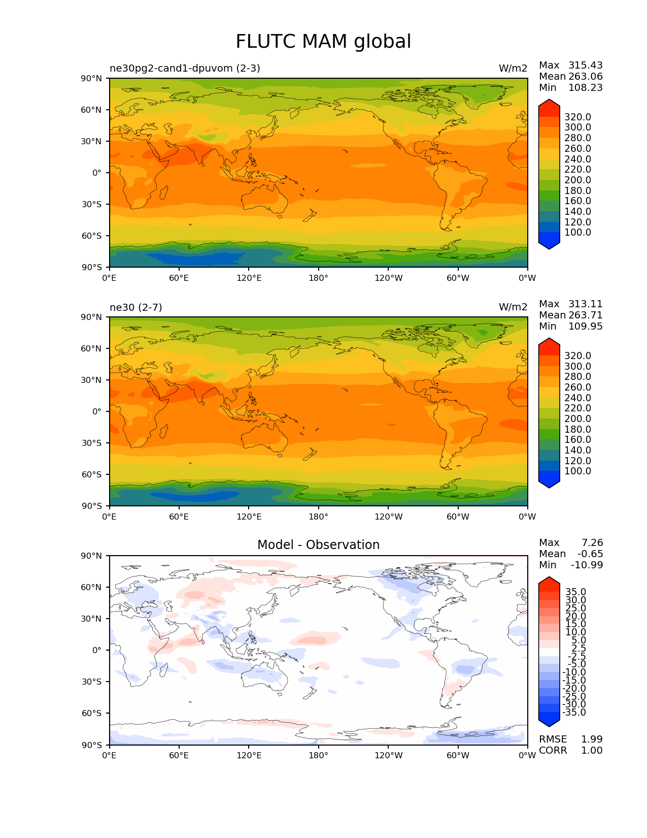 Use this command to recreate this image: | e3sm_diags --no_viewer --results_dir '/global/project/projectdirs/acme/www/ambrad/pg-ne30pg2-cand1-dpuvom' --variables 'FLUTC' --diff_colormap 'diverging_bwr.rgb' --contour_levels '100' '120' '140' '160' '180' '200' '220' '240' '260' '280' '300' '320' --diff_levels '-35' '-30' '-25' '-20' '-15' '-10' '-5' '-2.5' '2.5' '5' '10' '15' '20' '25' '30' '35' --test_colormap 'cet_rainbow.rgb' --backend 'mpl' --canvas_size_h '1628' --reference_colormap 'cet_rainbow.rgb' --reference_data_path '/global/cscratch1/sd/ambradl/acme_scratch/cori-knl/diags1/ne30' --main_title 'FLUTC MAM global' --test_data_path '/global/cscratch1/sd/ambradl/acme_scratch/cori-knl/diags1/ne30pg2-cand1-dpuvom' --regions 'global' --regrid_method 'conservative' --figsize '8.5' '11.0' --canvas_size_w '1212' --run_type 'model_vs_model' --regrid_tool 'esmf' --num_workers '4' --reference_name 'ne30' --output_format 'png' --case_id 'model_vs_model' --granulate 'variables' 'seasons' 'regions' 'plevs' --test_name 'ne30pg2-cand1-dpuvom' --seasons 'MAM' --arrows --selectors 'sets' 'seasons' --diff_title 'Model - Observation' --sets 'lat_lon' --dpi '150' |
