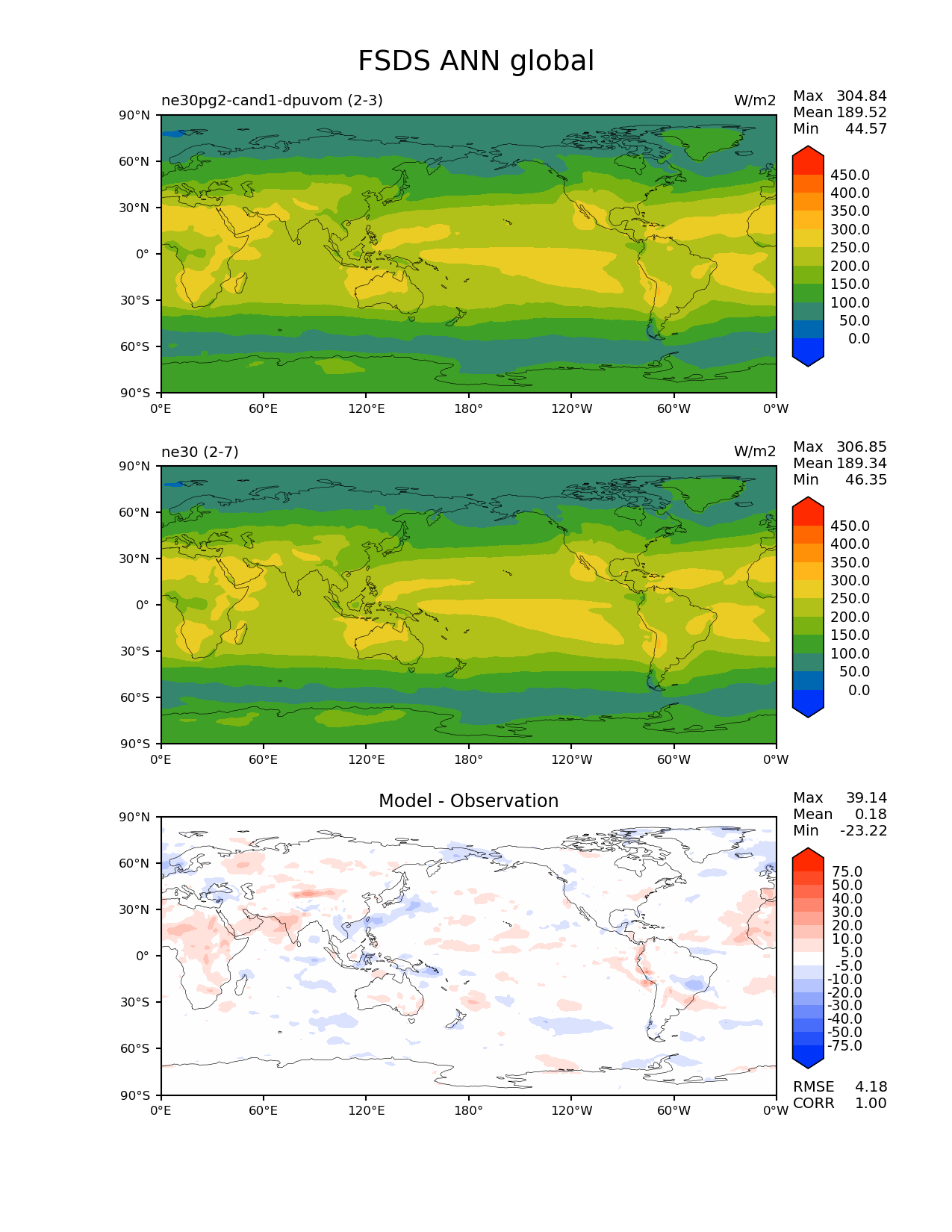 Use this command to recreate this image: | e3sm_diags --no_viewer --results_dir '/global/project/projectdirs/acme/www/ambrad/pg-ne30pg2-cand1-dpuvom' --variables 'FSDS' --diff_colormap 'diverging_bwr.rgb' --contour_levels '0' '50' '100' '150' '200' '250' '300' '350' '400' '450' --diff_levels '-75' '-50' '-40' '-30' '-20' '-10' '-5' '5' '10' '20' '30' '40' '50' '75' --test_colormap 'cet_rainbow.rgb' --backend 'mpl' --canvas_size_h '1628' --reference_colormap 'cet_rainbow.rgb' --reference_data_path '/global/cscratch1/sd/ambradl/acme_scratch/cori-knl/diags1/ne30' --main_title 'FSDS ANN global' --test_data_path '/global/cscratch1/sd/ambradl/acme_scratch/cori-knl/diags1/ne30pg2-cand1-dpuvom' --regions 'global' --regrid_method 'conservative' --figsize '8.5' '11.0' --canvas_size_w '1212' --run_type 'model_vs_model' --regrid_tool 'esmf' --num_workers '4' --reference_name 'ne30' --output_format 'png' --case_id 'model_vs_model' --granulate 'variables' 'seasons' 'regions' 'plevs' --test_name 'ne30pg2-cand1-dpuvom' --seasons 'ANN' --arrows --selectors 'sets' 'seasons' --diff_title 'Model - Observation' --sets 'lat_lon' --dpi '150' |
