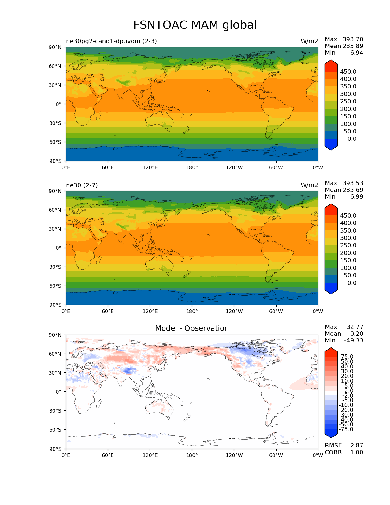 Use this command to recreate this image: | e3sm_diags --no_viewer --results_dir '/global/project/projectdirs/acme/www/ambrad/pg-ne30pg2-cand1-dpuvom' --variables 'FSNTOAC' --diff_colormap 'diverging_bwr.rgb' --contour_levels '0' '50' '100' '150' '200' '250' '300' '350' '400' '450' --diff_levels '-75' '-50' '-40' '-30' '-20' '-10' '-5' '-2' '2' '5' '10' '20' '30' '40' '50' '75' --test_colormap 'cet_rainbow.rgb' --backend 'mpl' --canvas_size_h '1628' --reference_colormap 'cet_rainbow.rgb' --reference_data_path '/global/cscratch1/sd/ambradl/acme_scratch/cori-knl/diags1/ne30' --main_title 'FSNTOAC MAM global' --test_data_path '/global/cscratch1/sd/ambradl/acme_scratch/cori-knl/diags1/ne30pg2-cand1-dpuvom' --regions 'global' --regrid_method 'conservative' --figsize '8.5' '11.0' --canvas_size_w '1212' --run_type 'model_vs_model' --regrid_tool 'esmf' --num_workers '4' --reference_name 'ne30' --output_format 'png' --case_id 'model_vs_model' --granulate 'variables' 'seasons' 'regions' 'plevs' --test_name 'ne30pg2-cand1-dpuvom' --seasons 'MAM' --arrows --selectors 'sets' 'seasons' --diff_title 'Model - Observation' --sets 'lat_lon' --dpi '150' |