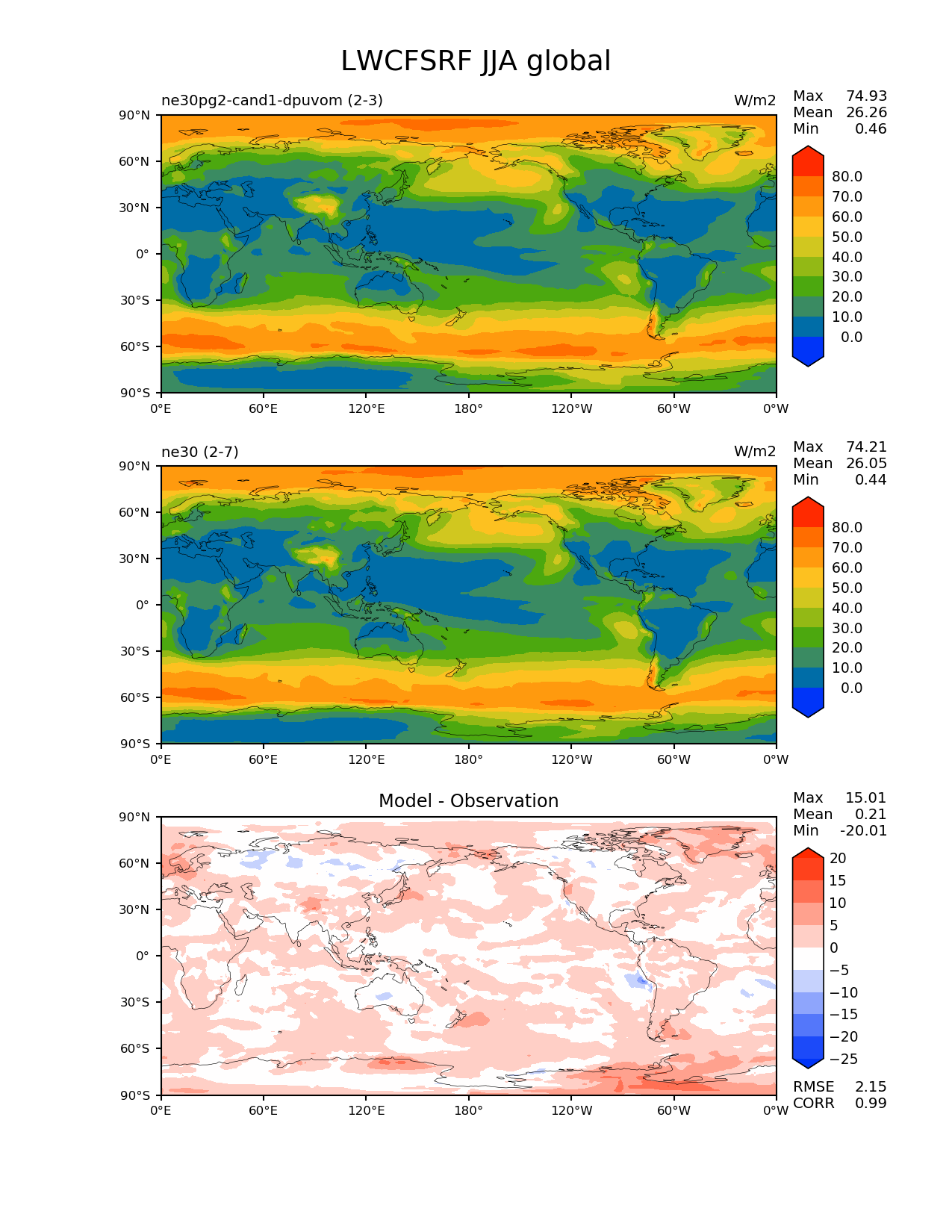 Use this command to recreate this image: | e3sm_diags --no_viewer --results_dir '/global/project/projectdirs/acme/www/ambrad/pg-ne30pg2-cand1-dpuvom' --variables 'LWCFSRF' --diff_colormap 'diverging_bwr.rgb' --contour_levels '0' '10' '20' '30' '40' '50' '60' '70' '80' --test_colormap 'cet_rainbow.rgb' --backend 'mpl' --canvas_size_h '1628' --reference_colormap 'cet_rainbow.rgb' --reference_data_path '/global/cscratch1/sd/ambradl/acme_scratch/cori-knl/diags1/ne30' --main_title 'LWCFSRF JJA global' --test_data_path '/global/cscratch1/sd/ambradl/acme_scratch/cori-knl/diags1/ne30pg2-cand1-dpuvom' --regions 'global' --regrid_method 'conservative' --figsize '8.5' '11.0' --canvas_size_w '1212' --run_type 'model_vs_model' --regrid_tool 'esmf' --num_workers '4' --reference_name 'ne30' --output_format 'png' --case_id 'model_vs_model' --granulate 'variables' 'seasons' 'regions' 'plevs' --test_name 'ne30pg2-cand1-dpuvom' --seasons 'JJA' --arrows --selectors 'sets' 'seasons' --diff_title 'Model - Observation' --sets 'lat_lon' --dpi '150' |