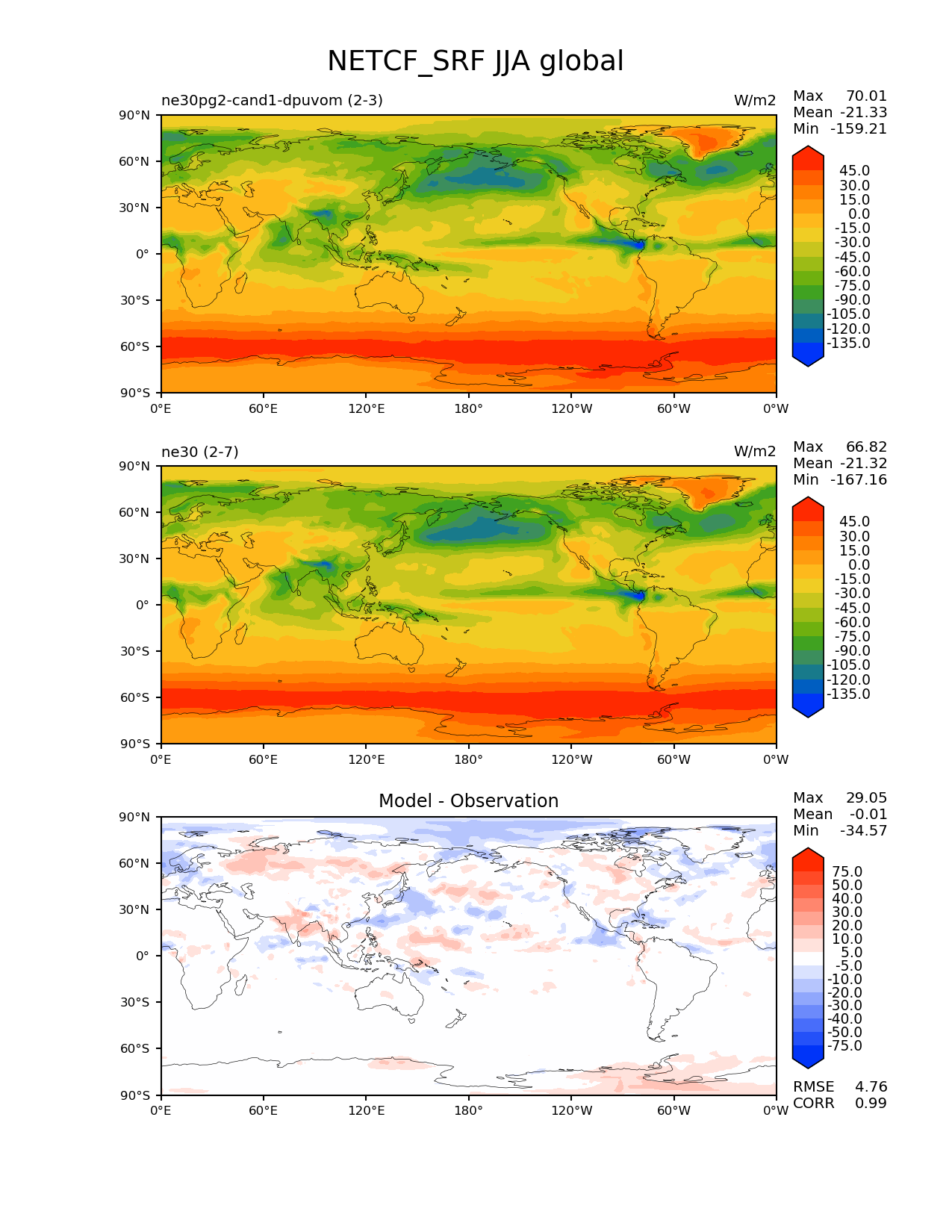 Use this command to recreate this image: | e3sm_diags --no_viewer --results_dir '/global/project/projectdirs/acme/www/ambrad/pg-ne30pg2-cand1-dpuvom' --variables 'NETCF_SRF' --diff_colormap 'diverging_bwr.rgb' --contour_levels '-135' '-120' '-105' '-90' '-75' '-60' '-45' '-30' '-15' '0' '15' '30' '45' --diff_levels '-75' '-50' '-40' '-30' '-20' '-10' '-5' '5' '10' '20' '30' '40' '50' '75' --test_colormap 'cet_rainbow.rgb' --backend 'mpl' --canvas_size_h '1628' --reference_colormap 'cet_rainbow.rgb' --reference_data_path '/global/cscratch1/sd/ambradl/acme_scratch/cori-knl/diags1/ne30' --main_title 'NETCF_SRF JJA global' --test_data_path '/global/cscratch1/sd/ambradl/acme_scratch/cori-knl/diags1/ne30pg2-cand1-dpuvom' --regions 'global' --regrid_method 'conservative' --figsize '8.5' '11.0' --canvas_size_w '1212' --run_type 'model_vs_model' --regrid_tool 'esmf' --num_workers '4' --reference_name 'ne30' --output_format 'png' --case_id 'model_vs_model' --granulate 'variables' 'seasons' 'regions' 'plevs' --test_name 'ne30pg2-cand1-dpuvom' --seasons 'JJA' --arrows --selectors 'sets' 'seasons' --diff_title 'Model - Observation' --sets 'lat_lon' --dpi '150' |