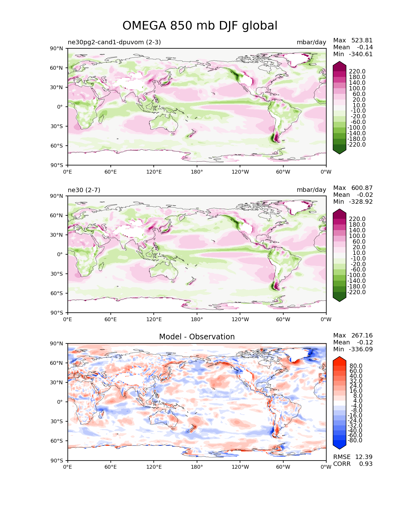 Use this command to recreate this image: | e3sm_diags --no_viewer --results_dir '/global/project/projectdirs/acme/www/ambrad/pg-ne30pg2-cand1-dpuvom' --variables 'OMEGA' --diff_colormap 'diverging_bwr.rgb' --contour_levels '-220' '-180' '-140' '-100' '-60' '-20' '-10' '10' '20' '60' '100' '140' '180' '220' --diff_levels '-80' '-60' '-40' '-32' '-24' '-16' '-8' '-4' '4' '8' '16' '24' '32' '40' '60' '80' --backend 'mpl' --canvas_size_h '1628' --reference_colormap 'PiYG_r' --reference_data_path '/global/cscratch1/sd/ambradl/acme_scratch/cori-knl/diags1/ne30' --main_title 'OMEGA 850 mb DJF global' --test_data_path '/global/cscratch1/sd/ambradl/acme_scratch/cori-knl/diags1/ne30pg2-cand1-dpuvom' --regions 'global' --test_colormap 'PiYG_r' --regrid_method 'conservative' --figsize '8.5' '11.0' --canvas_size_w '1212' --run_type 'model_vs_model' --regrid_tool 'esmf' --num_workers '4' --reference_name 'ne30' --output_format 'png' --case_id 'model_vs_model' --granulate 'variables' 'seasons' 'regions' 'plevs' --test_name 'ne30pg2-cand1-dpuvom' --seasons 'DJF' --arrows --selectors 'sets' 'seasons' --diff_title 'Model - Observation' --sets 'lat_lon' --plevs '850.0' --dpi '150' |