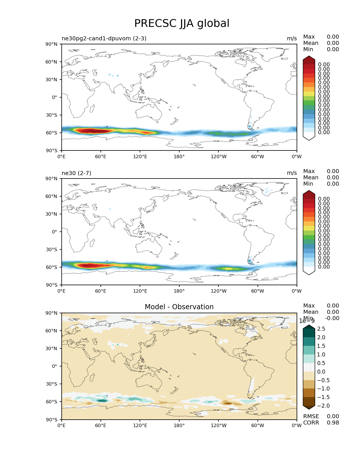 Use this command to recreate this image: | e3sm_diags --no_viewer --results_dir '/global/project/projectdirs/acme/www/ambrad/pg-ne30pg2-cand1-dpuvom' --variables 'PRECSC' --diff_colormap 'BrBG' --contour_levels '4.11764705882e-10' '8.23529411765e-10' '1.23529411765e-09' '1.64705882353e-09' '2.05882352941e-09' '2.47058823529e-09' '2.88235294118e-09' '3.29411764706e-09' '3.70588235294e-09' '4.11764705882e-09' '4.52941176471e-09' '4.94117647059e-09' '5.35294117647e-09' '5.76470588235e-09' '6.17647058824e-09' '6.58823529412e-09' --backend 'mpl' --canvas_size_h '1628' --reference_colormap 'WhiteBlueGreenYellowRed.rgb' --reference_data_path '/global/cscratch1/sd/ambradl/acme_scratch/cori-knl/diags1/ne30' --main_title 'PRECSC JJA global' --test_data_path '/global/cscratch1/sd/ambradl/acme_scratch/cori-knl/diags1/ne30pg2-cand1-dpuvom' --regions 'global' --test_colormap 'WhiteBlueGreenYellowRed.rgb' --regrid_method 'conservative' --figsize '8.5' '11.0' --canvas_size_w '1212' --run_type 'model_vs_model' --regrid_tool 'esmf' --num_workers '4' --reference_name 'ne30' --output_format 'png' --case_id 'model_vs_model' --granulate 'variables' 'seasons' 'regions' 'plevs' --test_name 'ne30pg2-cand1-dpuvom' --seasons 'JJA' --arrows --selectors 'sets' 'seasons' --diff_title 'Model - Observation' --sets 'lat_lon' --dpi '150' |