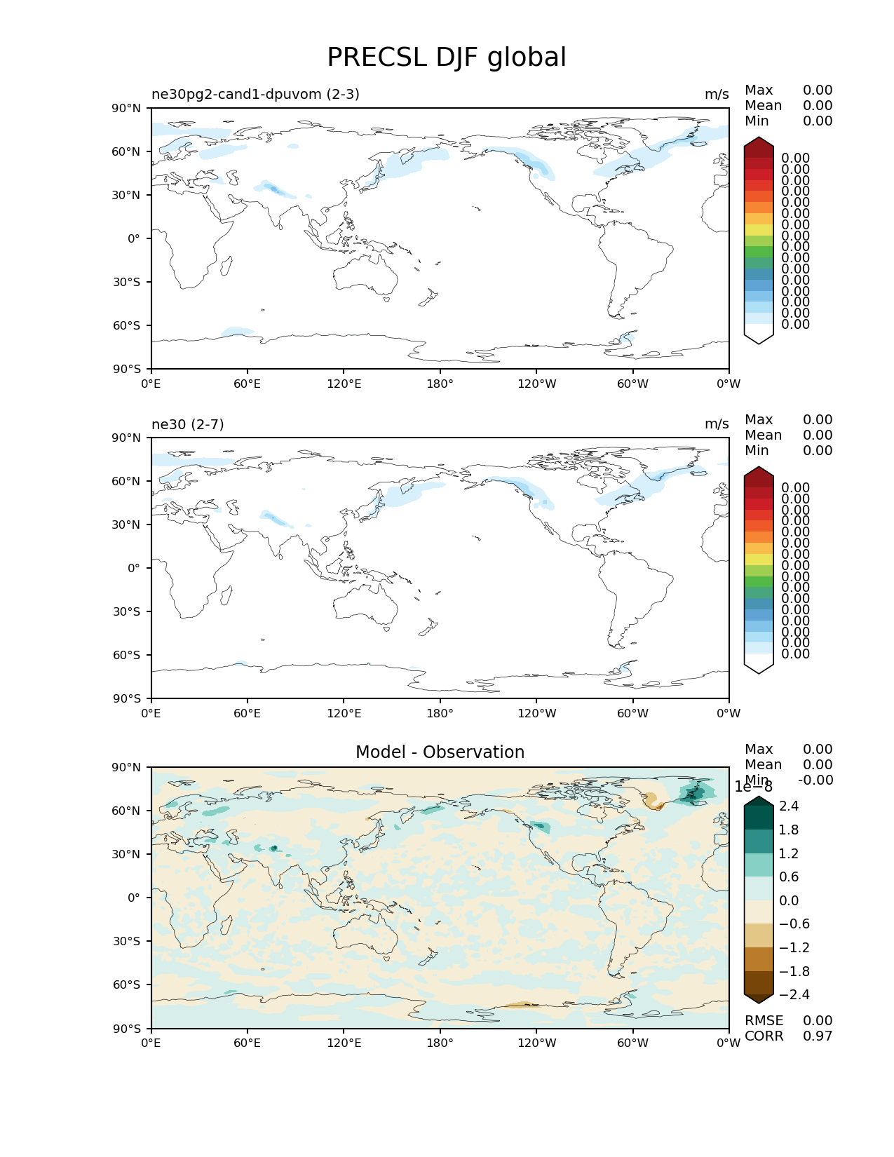 Use this command to recreate this image: | e3sm_diags --no_viewer --results_dir '/global/project/projectdirs/acme/www/ambrad/pg-ne30pg2-cand1-dpuvom' --variables 'PRECSL' --diff_colormap 'BrBG' --contour_levels '1.88235294118e-08' '3.76470588235e-08' '5.64705882353e-08' '7.52941176471e-08' '9.41176470588e-08' '1.12941176471e-07' '1.31764705882e-07' '1.50588235294e-07' '1.69411764706e-07' '1.88235294118e-07' '2.07058823529e-07' '2.25882352941e-07' '2.44705882353e-07' '2.63529411765e-07' '2.82352941176e-07' '3.01176470588e-07' --backend 'mpl' --canvas_size_h '1628' --reference_colormap 'WhiteBlueGreenYellowRed.rgb' --reference_data_path '/global/cscratch1/sd/ambradl/acme_scratch/cori-knl/diags1/ne30' --main_title 'PRECSL DJF global' --test_data_path '/global/cscratch1/sd/ambradl/acme_scratch/cori-knl/diags1/ne30pg2-cand1-dpuvom' --regions 'global' --test_colormap 'WhiteBlueGreenYellowRed.rgb' --regrid_method 'conservative' --figsize '8.5' '11.0' --canvas_size_w '1212' --run_type 'model_vs_model' --regrid_tool 'esmf' --num_workers '4' --reference_name 'ne30' --output_format 'png' --case_id 'model_vs_model' --granulate 'variables' 'seasons' 'regions' 'plevs' --test_name 'ne30pg2-cand1-dpuvom' --seasons 'DJF' --arrows --selectors 'sets' 'seasons' --diff_title 'Model - Observation' --sets 'lat_lon' --dpi '150' |