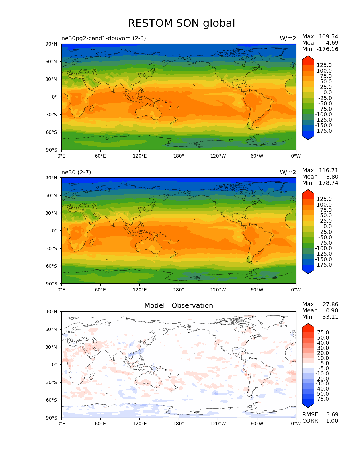 Use this command to recreate this image: | e3sm_diags --no_viewer --results_dir '/global/project/projectdirs/acme/www/ambrad/pg-ne30pg2-cand1-dpuvom' --variables 'RESTOM' --diff_colormap 'diverging_bwr.rgb' --contour_levels '-175' '-150' '-125' '-100' '-75' '-50' '-25' '0' '25' '50' '75' '100' '125' --diff_levels '-75' '-50' '-40' '-30' '-20' '-10' '-5' '5' '10' '20' '30' '40' '50' '75' --test_colormap 'cet_rainbow.rgb' --backend 'mpl' --canvas_size_h '1628' --reference_colormap 'cet_rainbow.rgb' --reference_data_path '/global/cscratch1/sd/ambradl/acme_scratch/cori-knl/diags1/ne30' --main_title 'RESTOM SON global' --test_data_path '/global/cscratch1/sd/ambradl/acme_scratch/cori-knl/diags1/ne30pg2-cand1-dpuvom' --regions 'global' --regrid_method 'conservative' --figsize '8.5' '11.0' --canvas_size_w '1212' --run_type 'model_vs_model' --regrid_tool 'esmf' --num_workers '4' --reference_name 'ne30' --output_format 'png' --case_id 'model_vs_model' --granulate 'variables' 'seasons' 'regions' 'plevs' --test_name 'ne30pg2-cand1-dpuvom' --seasons 'SON' --arrows --selectors 'sets' 'seasons' --diff_title 'Model - Observation' --sets 'lat_lon' --dpi '150' |