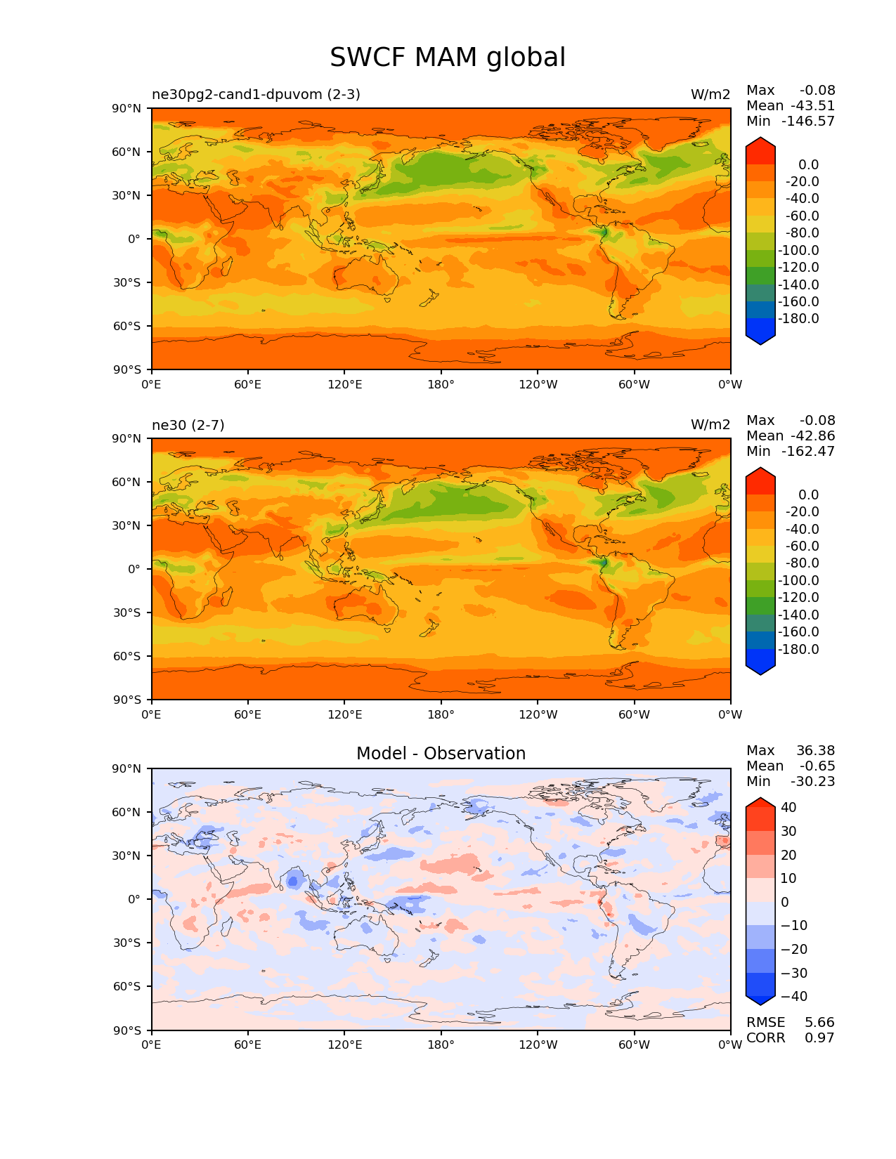 Use this command to recreate this image: | e3sm_diags --no_viewer --results_dir '/global/project/projectdirs/acme/www/ambrad/pg-ne30pg2-cand1-dpuvom' --variables 'SWCF' --diff_colormap 'diverging_bwr.rgb' --contour_levels '-180' '-160' '-140' '-120' '-100' '-80' '-60' '-40' '-20' '0' --test_colormap 'cet_rainbow.rgb' --backend 'mpl' --canvas_size_h '1628' --reference_colormap 'cet_rainbow.rgb' --reference_data_path '/global/cscratch1/sd/ambradl/acme_scratch/cori-knl/diags1/ne30' --main_title 'SWCF MAM global' --test_data_path '/global/cscratch1/sd/ambradl/acme_scratch/cori-knl/diags1/ne30pg2-cand1-dpuvom' --regions 'global' --regrid_method 'conservative' --figsize '8.5' '11.0' --canvas_size_w '1212' --run_type 'model_vs_model' --regrid_tool 'esmf' --num_workers '4' --reference_name 'ne30' --output_format 'png' --case_id 'model_vs_model' --granulate 'variables' 'seasons' 'regions' 'plevs' --test_name 'ne30pg2-cand1-dpuvom' --seasons 'MAM' --arrows --selectors 'sets' 'seasons' --diff_title 'Model - Observation' --sets 'lat_lon' --dpi '150' |