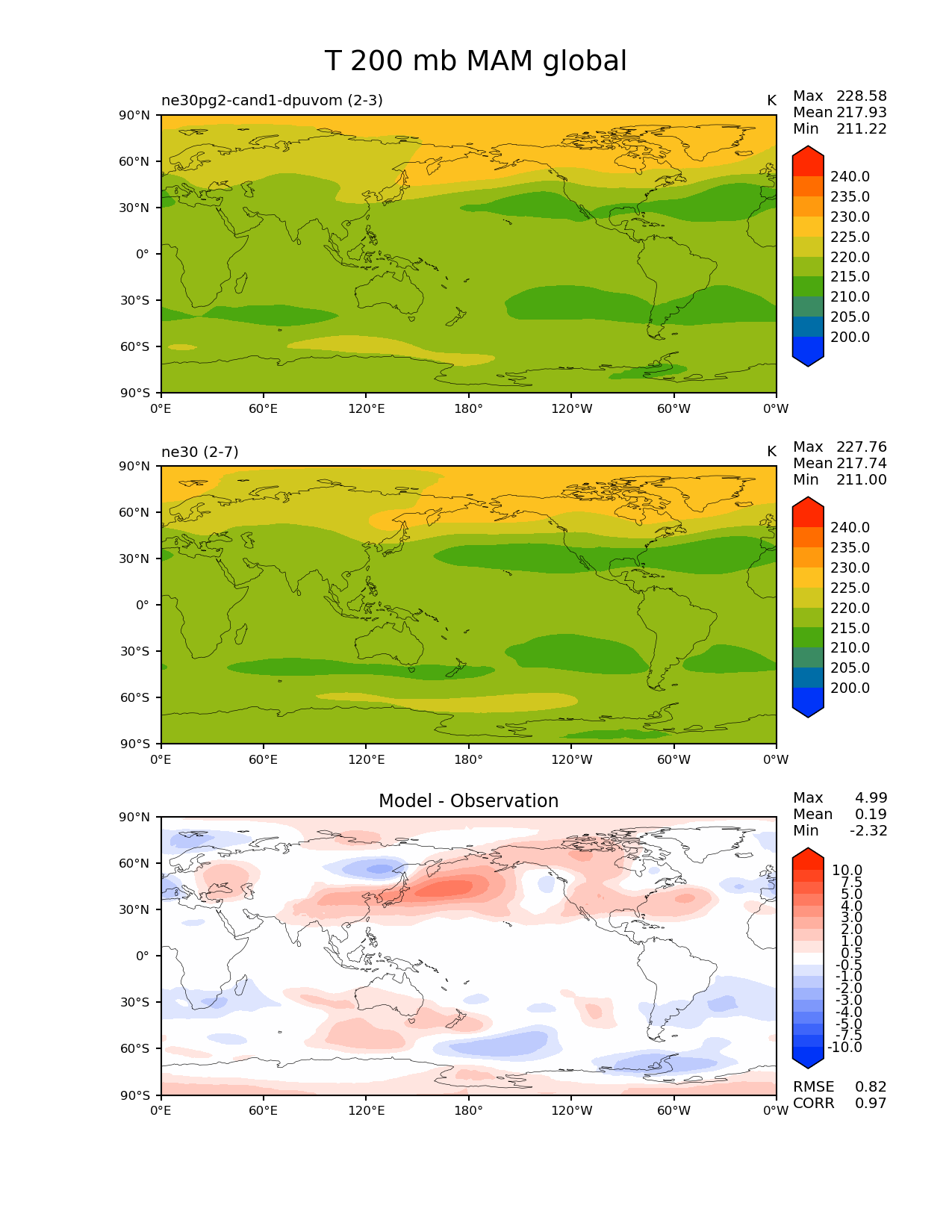 Use this command to recreate this image: | e3sm_diags --no_viewer --results_dir '/global/project/projectdirs/acme/www/ambrad/pg-ne30pg2-cand1-dpuvom' --variables 'T' --diff_colormap 'diverging_bwr.rgb' --contour_levels '200' '205' '210' '215' '220' '225' '230' '235' '240' --diff_levels '-10' '-7.5' '-5' '-4' '-3' '-2' '-1' '-0.5' '0.5' '1' '2' '3' '4' '5' '7.5' '10' --test_colormap 'cet_rainbow.rgb' --backend 'mpl' --canvas_size_h '1628' --reference_colormap 'cet_rainbow.rgb' --reference_data_path '/global/cscratch1/sd/ambradl/acme_scratch/cori-knl/diags1/ne30' --main_title 'T 200 mb MAM global' --test_data_path '/global/cscratch1/sd/ambradl/acme_scratch/cori-knl/diags1/ne30pg2-cand1-dpuvom' --regions 'global' --regrid_method 'conservative' --figsize '8.5' '11.0' --canvas_size_w '1212' --run_type 'model_vs_model' --regrid_tool 'esmf' --num_workers '4' --reference_name 'ne30' --output_format 'png' --case_id 'model_vs_model' --granulate 'variables' 'seasons' 'regions' 'plevs' --test_name 'ne30pg2-cand1-dpuvom' --seasons 'MAM' --arrows --selectors 'sets' 'seasons' --diff_title 'Model - Observation' --sets 'lat_lon' --plevs '200.0' --dpi '150' |