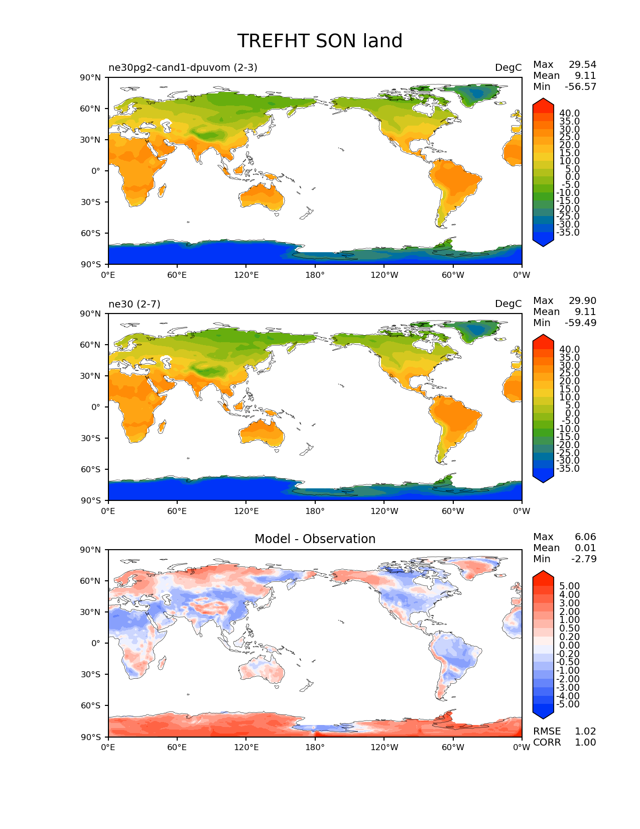 Use this command to recreate this image: | e3sm_diags --no_viewer --results_dir '/global/project/projectdirs/acme/www/ambrad/pg-ne30pg2-cand1-dpuvom' --variables 'TREFHT' --diff_colormap 'diverging_bwr.rgb' --contour_levels '-35' '-30' '-25' '-20' '-15' '-10' '-5' '0' '5' '10' '15' '20' '25' '30' '35' '40' --diff_levels '-5' '-4' '-3' '-2' '-1' '-0.5' '-0.2' '0' '0.2' '0.5' '1' '2' '3' '4' '5' --test_colormap 'cet_rainbow.rgb' --backend 'mpl' --canvas_size_h '1628' --reference_colormap 'cet_rainbow.rgb' --reference_data_path '/global/cscratch1/sd/ambradl/acme_scratch/cori-knl/diags1/ne30' --main_title 'TREFHT SON land' --test_data_path '/global/cscratch1/sd/ambradl/acme_scratch/cori-knl/diags1/ne30pg2-cand1-dpuvom' --regions 'land' --regrid_method 'conservative' --figsize '8.5' '11.0' --canvas_size_w '1212' --run_type 'model_vs_model' --regrid_tool 'esmf' --num_workers '4' --reference_name 'ne30' --output_format 'png' --case_id 'model_vs_model' --granulate 'variables' 'seasons' 'regions' 'plevs' --test_name 'ne30pg2-cand1-dpuvom' --seasons 'SON' --arrows --selectors 'sets' 'seasons' --diff_title 'Model - Observation' --sets 'lat_lon' --dpi '150' |