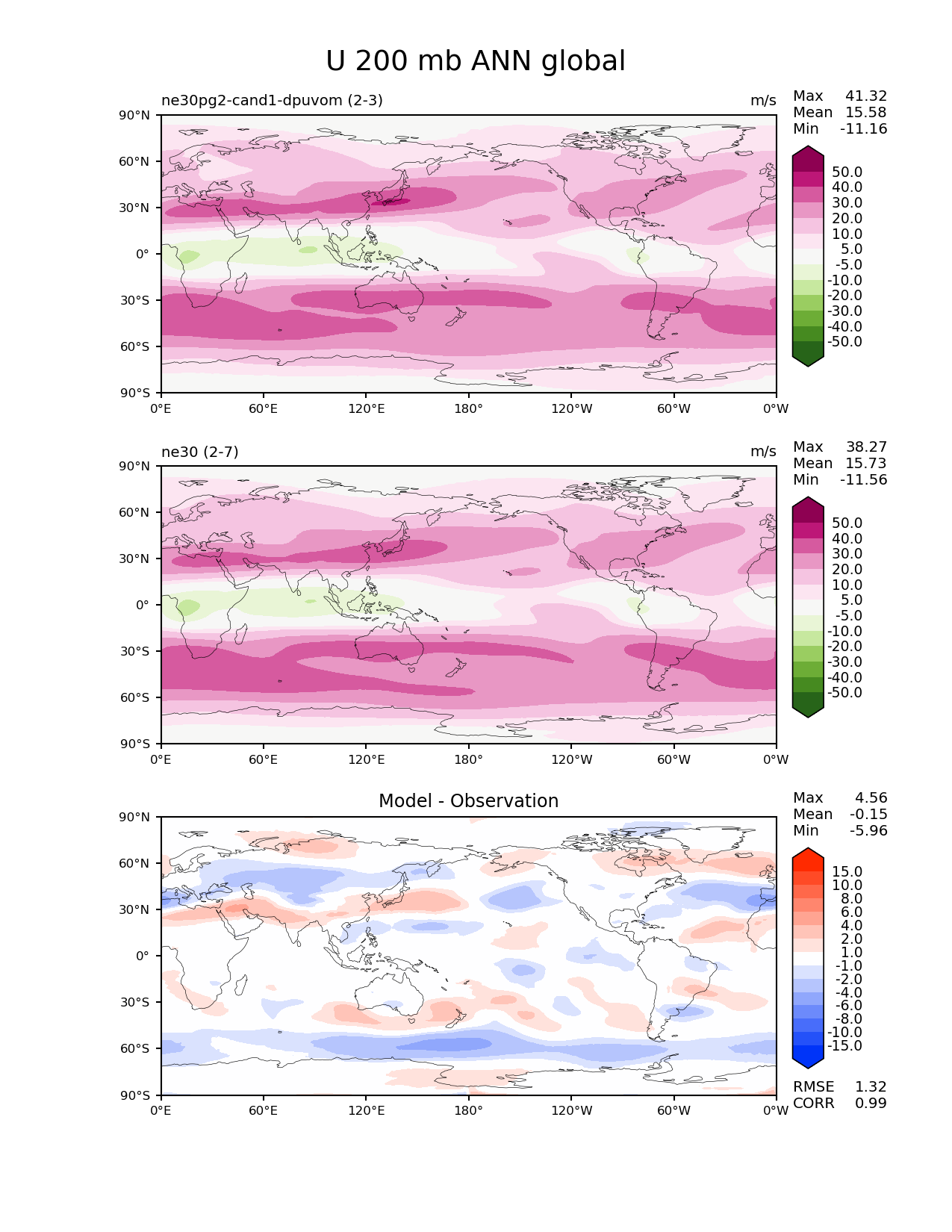 Use this command to recreate this image: | e3sm_diags --no_viewer --results_dir '/global/project/projectdirs/acme/www/ambrad/pg-ne30pg2-cand1-dpuvom' --variables 'U' --diff_colormap 'diverging_bwr.rgb' --contour_levels '-50' '-40' '-30' '-20' '-10' '-5' '5' '10' '20' '30' '40' '50' --diff_levels '-15' '-10' '-8' '-6' '-4' '-2' '-1' '1' '2' '4' '6' '8' '10' '15' --backend 'mpl' --canvas_size_h '1628' --reference_colormap 'PiYG_r' --reference_data_path '/global/cscratch1/sd/ambradl/acme_scratch/cori-knl/diags1/ne30' --main_title 'U 200 mb ANN global' --test_data_path '/global/cscratch1/sd/ambradl/acme_scratch/cori-knl/diags1/ne30pg2-cand1-dpuvom' --regions 'global' --test_colormap 'PiYG_r' --regrid_method 'conservative' --figsize '8.5' '11.0' --canvas_size_w '1212' --run_type 'model_vs_model' --regrid_tool 'esmf' --num_workers '4' --reference_name 'ne30' --output_format 'png' --case_id 'model_vs_model' --granulate 'variables' 'seasons' 'regions' 'plevs' --test_name 'ne30pg2-cand1-dpuvom' --seasons 'ANN' --arrows --selectors 'sets' 'seasons' --diff_title 'Model - Observation' --sets 'lat_lon' --plevs '200.0' --dpi '150' |