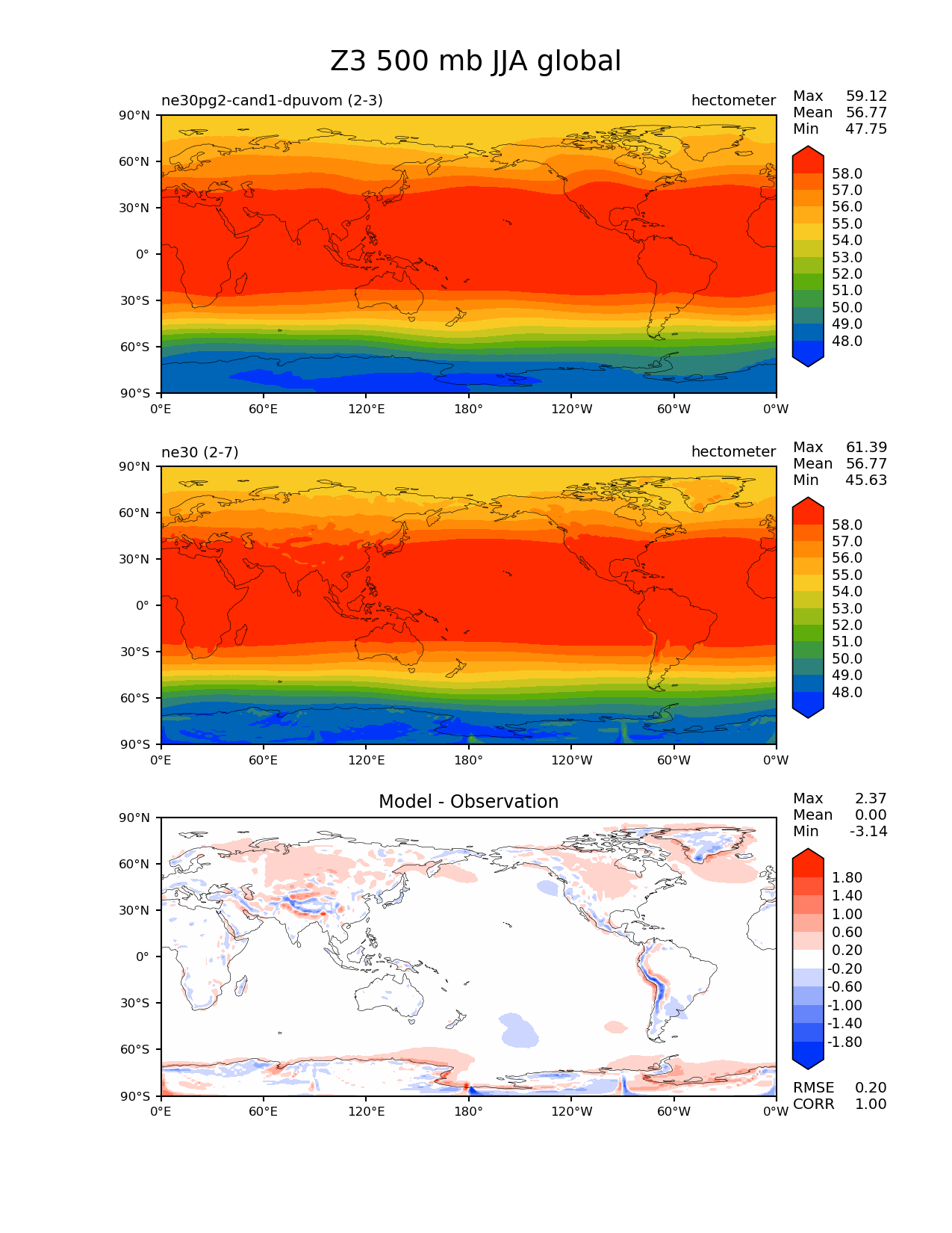 Use this command to recreate this image: | e3sm_diags --no_viewer --results_dir '/global/project/projectdirs/acme/www/ambrad/pg-ne30pg2-cand1-dpuvom' --variables 'Z3' --diff_colormap 'diverging_bwr.rgb' --contour_levels '48' '49' '50' '51' '52' '53' '54' '55' '56' '57' '58' --diff_levels '-1.8' '-1.4' '-1.0' '-0.6' '-0.2' '0.2' '0.6' '1.0' '1.4' '1.8' --test_colormap 'cet_rainbow.rgb' --backend 'mpl' --canvas_size_h '1628' --reference_colormap 'cet_rainbow.rgb' --reference_data_path '/global/cscratch1/sd/ambradl/acme_scratch/cori-knl/diags1/ne30' --main_title 'Z3 500 mb JJA global' --test_data_path '/global/cscratch1/sd/ambradl/acme_scratch/cori-knl/diags1/ne30pg2-cand1-dpuvom' --regions 'global' --regrid_method 'conservative' --figsize '8.5' '11.0' --canvas_size_w '1212' --run_type 'model_vs_model' --regrid_tool 'esmf' --num_workers '4' --reference_name 'ne30' --output_format 'png' --case_id 'model_vs_model' --granulate 'variables' 'seasons' 'regions' 'plevs' --test_name 'ne30pg2-cand1-dpuvom' --seasons 'JJA' --arrows --selectors 'sets' 'seasons' --diff_title 'Model - Observation' --sets 'lat_lon' --plevs '500.0' --dpi '150' |