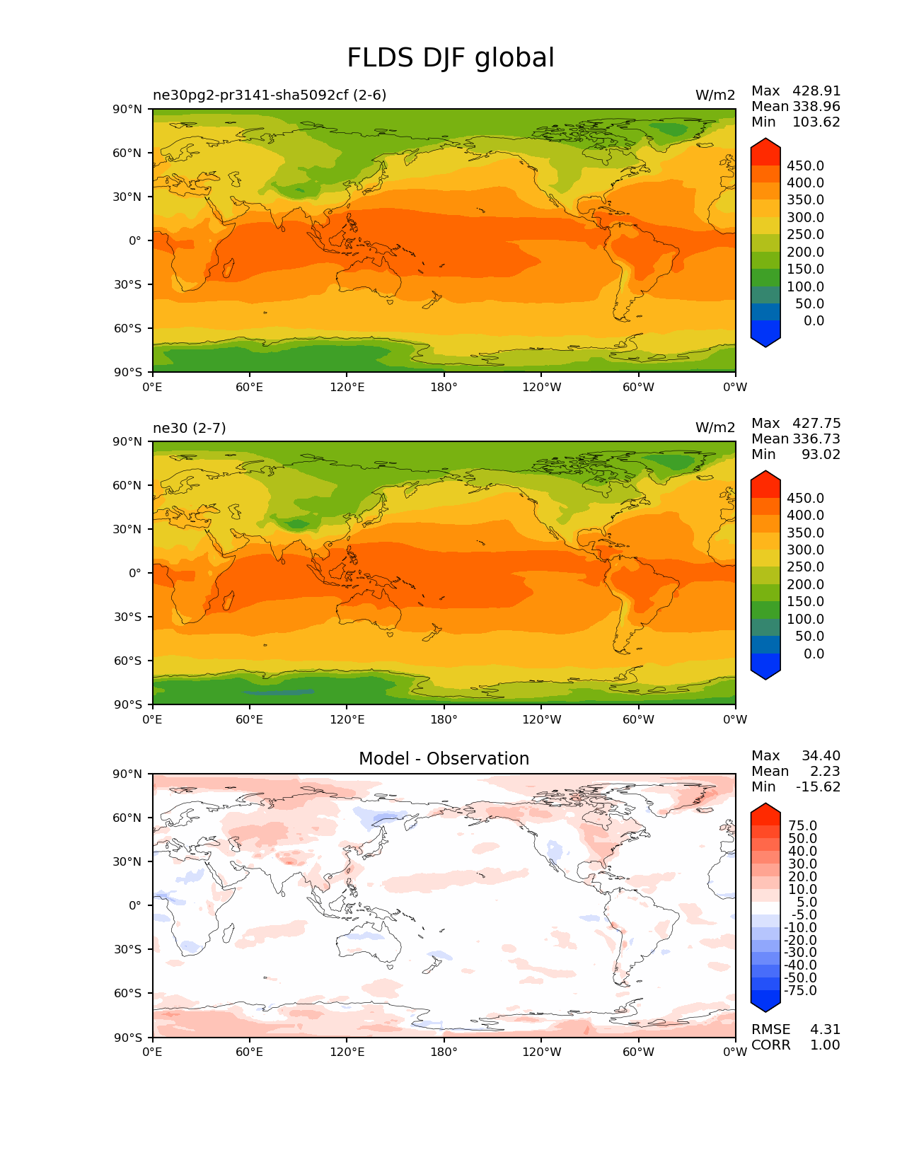 Use this command to recreate this image: | e3sm_diags --no_viewer --results_dir '/global/project/projectdirs/acme/www/ambrad/pg-ne30pg2-pr3141-sha5092cf' --variables 'FLDS' --diff_colormap 'diverging_bwr.rgb' --contour_levels '0' '50' '100' '150' '200' '250' '300' '350' '400' '450' --diff_levels '-75' '-50' '-40' '-30' '-20' '-10' '-5' '5' '10' '20' '30' '40' '50' '75' --test_colormap 'cet_rainbow.rgb' --backend 'mpl' --canvas_size_h '1628' --reference_colormap 'cet_rainbow.rgb' --reference_data_path '/global/cscratch1/sd/ambradl/acme_scratch/cori-knl/diags1/ne30' --main_title 'FLDS DJF global' --test_data_path '/global/cscratch1/sd/ambradl/acme_scratch/cori-knl/diags1/ne30pg2-pr3141-sha5092cf' --regions 'global' --regrid_method 'conservative' --figsize '8.5' '11.0' --canvas_size_w '1212' --run_type 'model_vs_model' --regrid_tool 'esmf' --num_workers '4' --reference_name 'ne30' --output_format 'png' --case_id 'model_vs_model' --granulate 'variables' 'seasons' 'regions' 'plevs' --test_name 'ne30pg2-pr3141-sha5092cf' --seasons 'DJF' --arrows --selectors 'sets' 'seasons' --diff_title 'Model - Observation' --sets 'lat_lon' --dpi '150' |