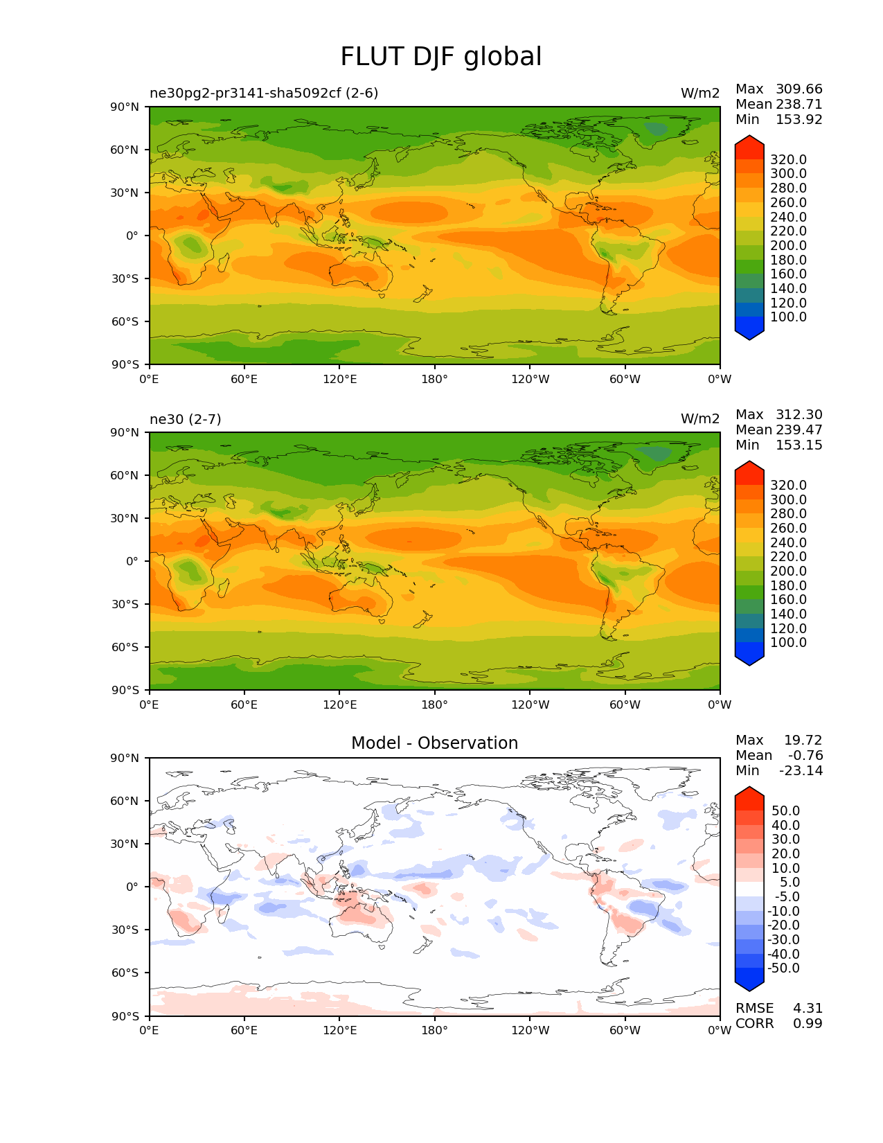Use this command to recreate this image: | e3sm_diags --no_viewer --results_dir '/global/project/projectdirs/acme/www/ambrad/pg-ne30pg2-pr3141-sha5092cf' --variables 'FLUT' --diff_colormap 'diverging_bwr.rgb' --contour_levels '100' '120' '140' '160' '180' '200' '220' '240' '260' '280' '300' '320' --diff_levels '-50' '-40' '-30' '-20' '-10' '-5' '5' '10' '20' '30' '40' '50' --test_colormap 'cet_rainbow.rgb' --backend 'mpl' --canvas_size_h '1628' --reference_colormap 'cet_rainbow.rgb' --reference_data_path '/global/cscratch1/sd/ambradl/acme_scratch/cori-knl/diags1/ne30' --main_title 'FLUT DJF global' --test_data_path '/global/cscratch1/sd/ambradl/acme_scratch/cori-knl/diags1/ne30pg2-pr3141-sha5092cf' --regions 'global' --regrid_method 'conservative' --figsize '8.5' '11.0' --canvas_size_w '1212' --run_type 'model_vs_model' --regrid_tool 'esmf' --num_workers '4' --reference_name 'ne30' --output_format 'png' --case_id 'model_vs_model' --granulate 'variables' 'seasons' 'regions' 'plevs' --test_name 'ne30pg2-pr3141-sha5092cf' --seasons 'DJF' --arrows --selectors 'sets' 'seasons' --diff_title 'Model - Observation' --sets 'lat_lon' --dpi '150' |