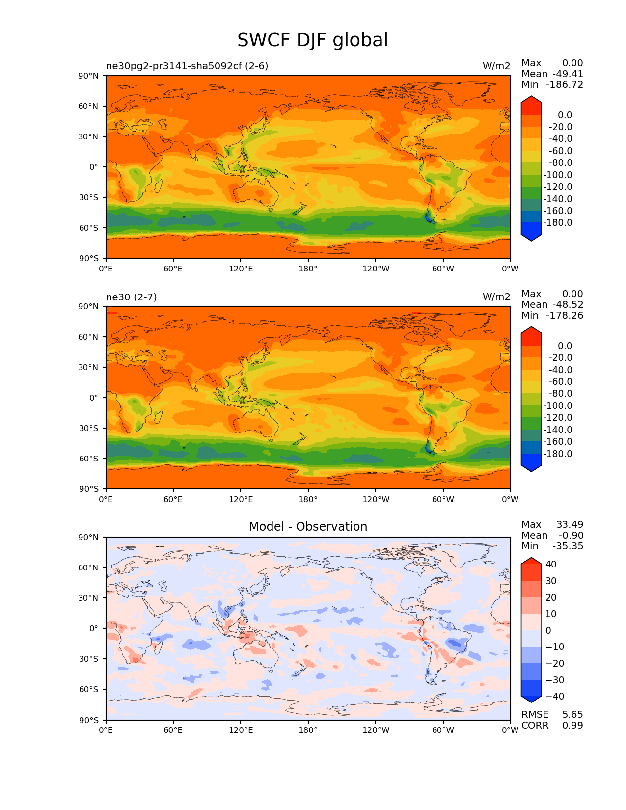 Use this command to recreate this image: | e3sm_diags --no_viewer --results_dir '/global/project/projectdirs/acme/www/ambrad/pg-ne30pg2-pr3141-sha5092cf' --variables 'SWCF' --diff_colormap 'diverging_bwr.rgb' --contour_levels '-180' '-160' '-140' '-120' '-100' '-80' '-60' '-40' '-20' '0' --test_colormap 'cet_rainbow.rgb' --backend 'mpl' --canvas_size_h '1628' --reference_colormap 'cet_rainbow.rgb' --reference_data_path '/global/cscratch1/sd/ambradl/acme_scratch/cori-knl/diags1/ne30' --main_title 'SWCF DJF global' --test_data_path '/global/cscratch1/sd/ambradl/acme_scratch/cori-knl/diags1/ne30pg2-pr3141-sha5092cf' --regions 'global' --regrid_method 'conservative' --figsize '8.5' '11.0' --canvas_size_w '1212' --run_type 'model_vs_model' --regrid_tool 'esmf' --num_workers '4' --reference_name 'ne30' --output_format 'png' --case_id 'model_vs_model' --granulate 'variables' 'seasons' 'regions' 'plevs' --test_name 'ne30pg2-pr3141-sha5092cf' --seasons 'DJF' --arrows --selectors 'sets' 'seasons' --diff_title 'Model - Observation' --sets 'lat_lon' --dpi '150' |