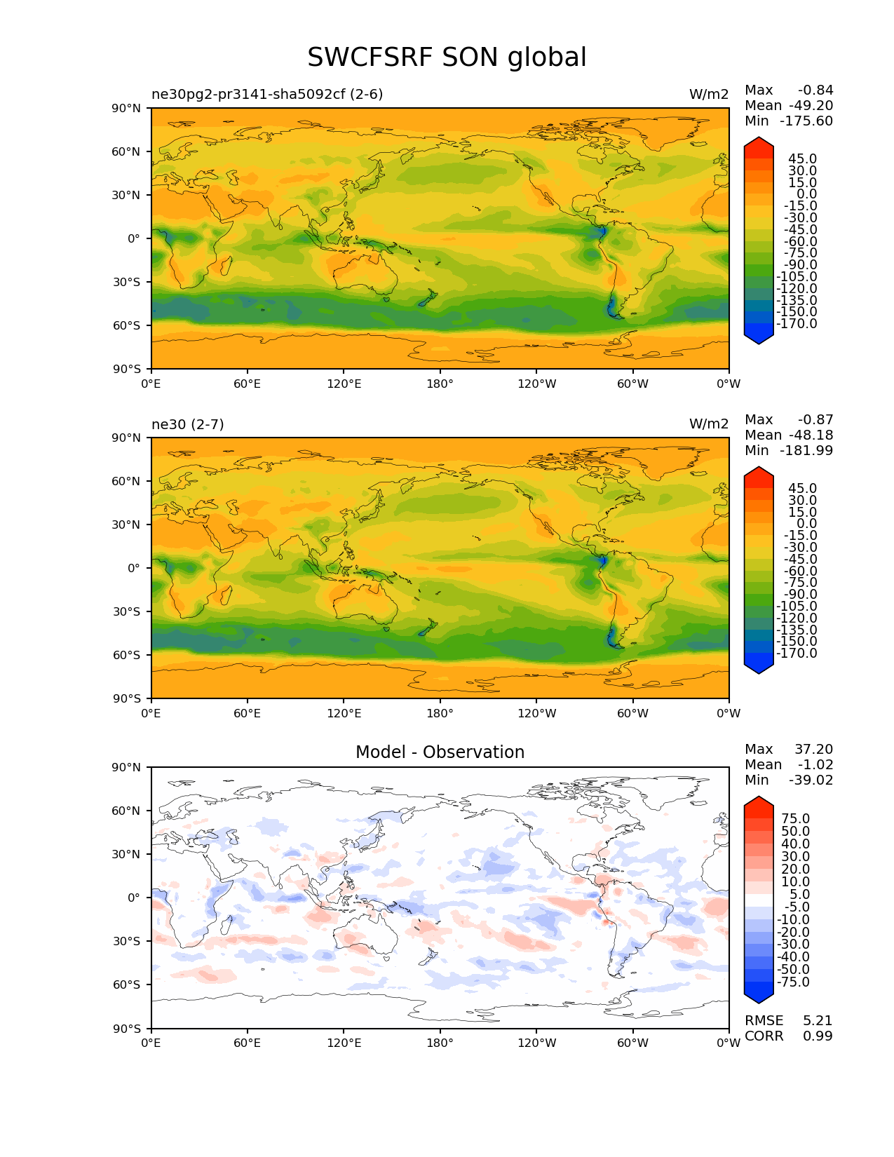 Use this command to recreate this image: | e3sm_diags --no_viewer --results_dir '/global/project/projectdirs/acme/www/ambrad/pg-ne30pg2-pr3141-sha5092cf' --variables 'SWCFSRF' --diff_colormap 'diverging_bwr.rgb' --contour_levels '-170' '-150' '-135' '-120' '-105' '-90' '-75' '-60' '-45' '-30' '-15' '0' '15' '30' '45' --diff_levels '-75' '-50' '-40' '-30' '-20' '-10' '-5' '5' '10' '20' '30' '40' '50' '75' --test_colormap 'cet_rainbow.rgb' --backend 'mpl' --canvas_size_h '1628' --reference_colormap 'cet_rainbow.rgb' --reference_data_path '/global/cscratch1/sd/ambradl/acme_scratch/cori-knl/diags1/ne30' --main_title 'SWCFSRF SON global' --test_data_path '/global/cscratch1/sd/ambradl/acme_scratch/cori-knl/diags1/ne30pg2-pr3141-sha5092cf' --regions 'global' --regrid_method 'conservative' --figsize '8.5' '11.0' --canvas_size_w '1212' --run_type 'model_vs_model' --regrid_tool 'esmf' --num_workers '4' --reference_name 'ne30' --output_format 'png' --case_id 'model_vs_model' --granulate 'variables' 'seasons' 'regions' 'plevs' --test_name 'ne30pg2-pr3141-sha5092cf' --seasons 'SON' --arrows --selectors 'sets' 'seasons' --diff_title 'Model - Observation' --sets 'lat_lon' --dpi '150' |