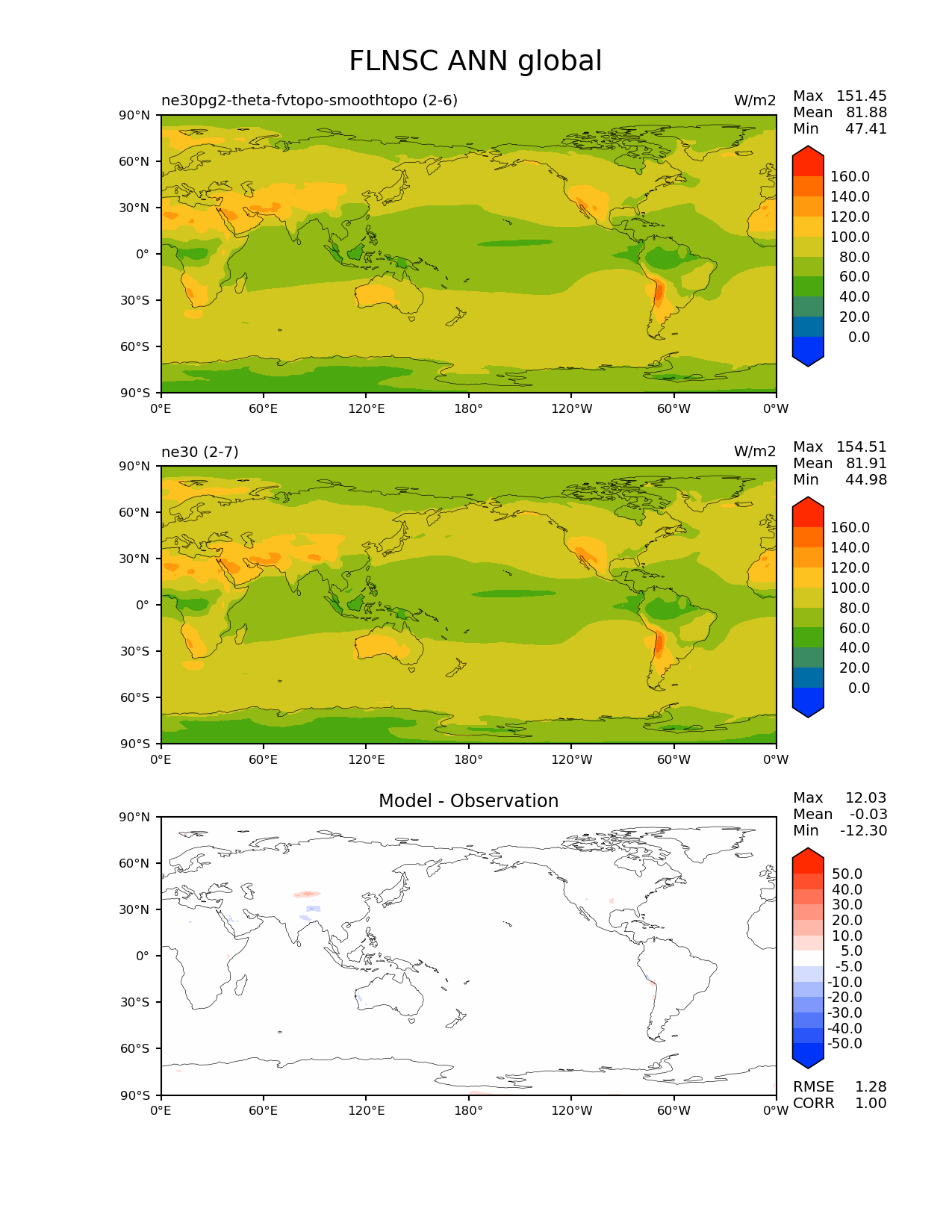 Use this command to recreate this image: | e3sm_diags --no_viewer --results_dir '/global/project/projectdirs/acme/www/ambrad/pg-ne30pg2-theta-fvtopo-smoothtopo' --variables 'FLNSC' --diff_colormap 'diverging_bwr.rgb' --contour_levels '0' '20' '40' '60' '80' '100' '120' '140' '160' --diff_levels '-50' '-40' '-30' '-20' '-10' '-5' '5' '10' '20' '30' '40' '50' --test_colormap 'cet_rainbow.rgb' --backend 'mpl' --canvas_size_h '1628' --reference_colormap 'cet_rainbow.rgb' --reference_data_path '/global/cscratch1/sd/ambradl/acme_scratch/cori-knl/diags1/ne30' --main_title 'FLNSC ANN global' --test_data_path '/global/cscratch1/sd/ambradl/acme_scratch/cori-knl/diags1/ne30pg2-theta-fvtopo-smoothtopo' --regions 'global' --regrid_method 'conservative' --figsize '8.5' '11.0' --canvas_size_w '1212' --run_type 'model_vs_model' --regrid_tool 'esmf' --num_workers '4' --reference_name 'ne30' --output_format 'png' --case_id 'model_vs_model' --granulate 'variables' 'seasons' 'regions' 'plevs' --test_name 'ne30pg2-theta-fvtopo-smoothtopo' --seasons 'ANN' --arrows --selectors 'sets' 'seasons' --diff_title 'Model - Observation' --sets 'lat_lon' --dpi '150' |