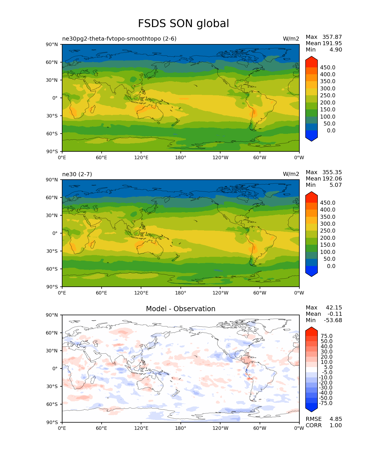 Use this command to recreate this image: | e3sm_diags --no_viewer --results_dir '/global/project/projectdirs/acme/www/ambrad/pg-ne30pg2-theta-fvtopo-smoothtopo' --variables 'FSDS' --diff_colormap 'diverging_bwr.rgb' --contour_levels '0' '50' '100' '150' '200' '250' '300' '350' '400' '450' --diff_levels '-75' '-50' '-40' '-30' '-20' '-10' '-5' '5' '10' '20' '30' '40' '50' '75' --test_colormap 'cet_rainbow.rgb' --backend 'mpl' --canvas_size_h '1628' --reference_colormap 'cet_rainbow.rgb' --reference_data_path '/global/cscratch1/sd/ambradl/acme_scratch/cori-knl/diags1/ne30' --main_title 'FSDS SON global' --test_data_path '/global/cscratch1/sd/ambradl/acme_scratch/cori-knl/diags1/ne30pg2-theta-fvtopo-smoothtopo' --regions 'global' --regrid_method 'conservative' --figsize '8.5' '11.0' --canvas_size_w '1212' --run_type 'model_vs_model' --regrid_tool 'esmf' --num_workers '4' --reference_name 'ne30' --output_format 'png' --case_id 'model_vs_model' --granulate 'variables' 'seasons' 'regions' 'plevs' --test_name 'ne30pg2-theta-fvtopo-smoothtopo' --seasons 'SON' --arrows --selectors 'sets' 'seasons' --diff_title 'Model - Observation' --sets 'lat_lon' --dpi '150' |