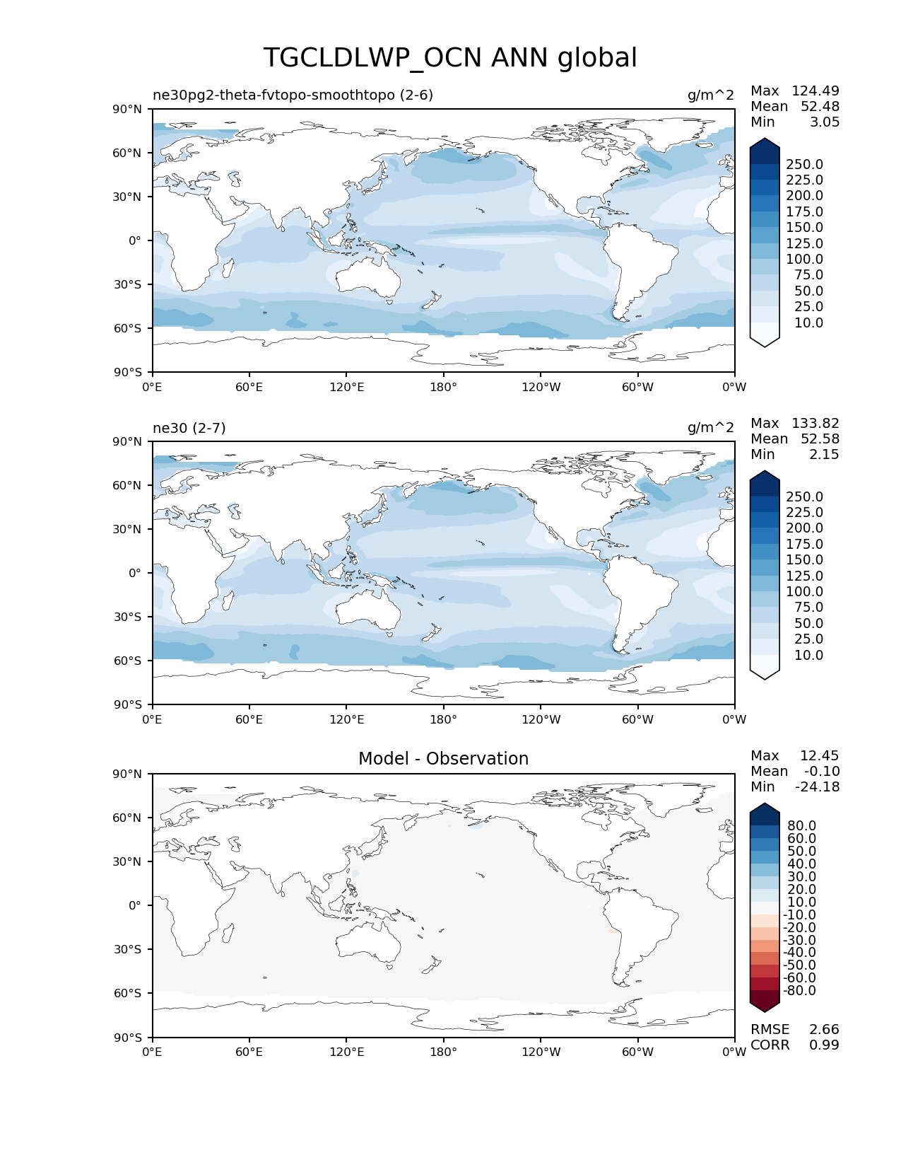 Use this command to recreate this image: | e3sm_diags --no_viewer --results_dir '/global/project/projectdirs/acme/www/ambrad/pg-ne30pg2-theta-fvtopo-smoothtopo' --variables 'TGCLDLWP_OCN' --diff_colormap 'RdBu' --contour_levels '10' '25' '50' '75' '100' '125' '150' '175' '200' '225' '250' --diff_levels '-80' '-60' '-50' '-40' '-30' '-20' '-10' '10' '20' '30' '40' '50' '60' '80' --backend 'mpl' --canvas_size_h '1628' --reference_colormap 'Blues' --reference_data_path '/global/cscratch1/sd/ambradl/acme_scratch/cori-knl/diags1/ne30' --main_title 'TGCLDLWP_OCN ANN global' --test_data_path '/global/cscratch1/sd/ambradl/acme_scratch/cori-knl/diags1/ne30pg2-theta-fvtopo-smoothtopo' --regions 'global' --test_colormap 'Blues' --regrid_method 'conservative' --figsize '8.5' '11.0' --canvas_size_w '1212' --run_type 'model_vs_model' --regrid_tool 'esmf' --num_workers '4' --reference_name 'ne30' --output_format 'png' --case_id 'model_vs_model' --granulate 'variables' 'seasons' 'regions' 'plevs' --test_name 'ne30pg2-theta-fvtopo-smoothtopo' --seasons 'ANN' --arrows --selectors 'sets' 'seasons' --diff_title 'Model - Observation' --sets 'lat_lon' --dpi '150' |