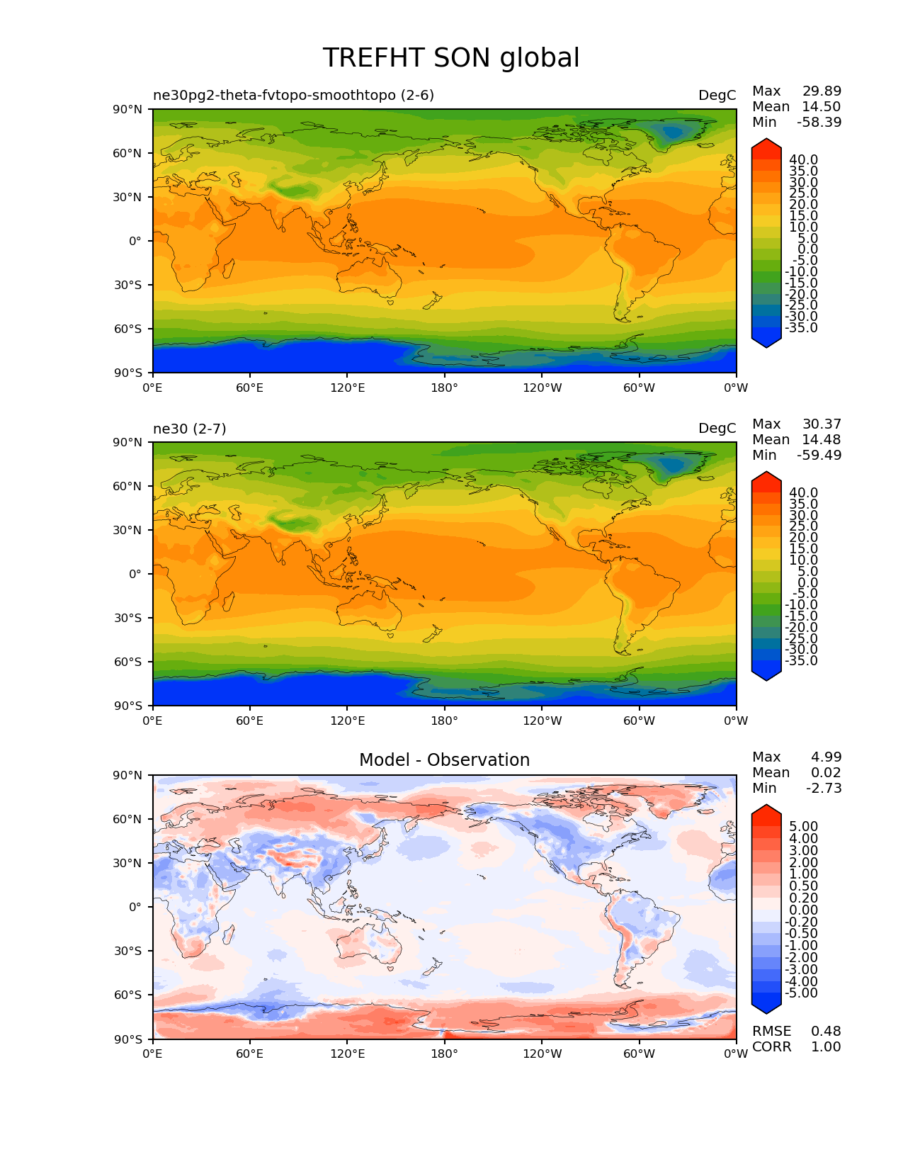 Use this command to recreate this image: | e3sm_diags --no_viewer --results_dir '/global/project/projectdirs/acme/www/ambrad/pg-ne30pg2-theta-fvtopo-smoothtopo' --variables 'TREFHT' --diff_colormap 'diverging_bwr.rgb' --contour_levels '5' '10' '15' '20' '25' '30' '40' '50' '60' '70' '75' '80' '85' '90' '95' --diff_levels '-50' '-40' '-30' '-20' '-15' '-10' '-5' '5' '10' '15' '20' '30' '40' '50' --test_colormap 'cet_rainbow.rgb' --backend 'mpl' --canvas_size_h '1628' --reference_colormap 'cet_rainbow.rgb' --reference_data_path '/global/cscratch1/sd/ambradl/acme_scratch/cori-knl/diags1/ne30' --main_title 'TREFHT SON global' --test_data_path '/global/cscratch1/sd/ambradl/acme_scratch/cori-knl/diags1/ne30pg2-theta-fvtopo-smoothtopo' --regions 'global' --regrid_method 'conservative' --figsize '8.5' '11.0' --canvas_size_w '1212' --run_type 'model_vs_model' --regrid_tool 'esmf' --num_workers '4' --reference_name 'ne30' --output_format 'png' --case_id 'model_vs_model' --granulate 'variables' 'seasons' 'regions' 'plevs' --test_name 'ne30pg2-theta-fvtopo-smoothtopo' --seasons 'SON' --arrows --selectors 'sets' 'seasons' --diff_title 'Model - Observation' --sets 'lat_lon' --dpi '150' |