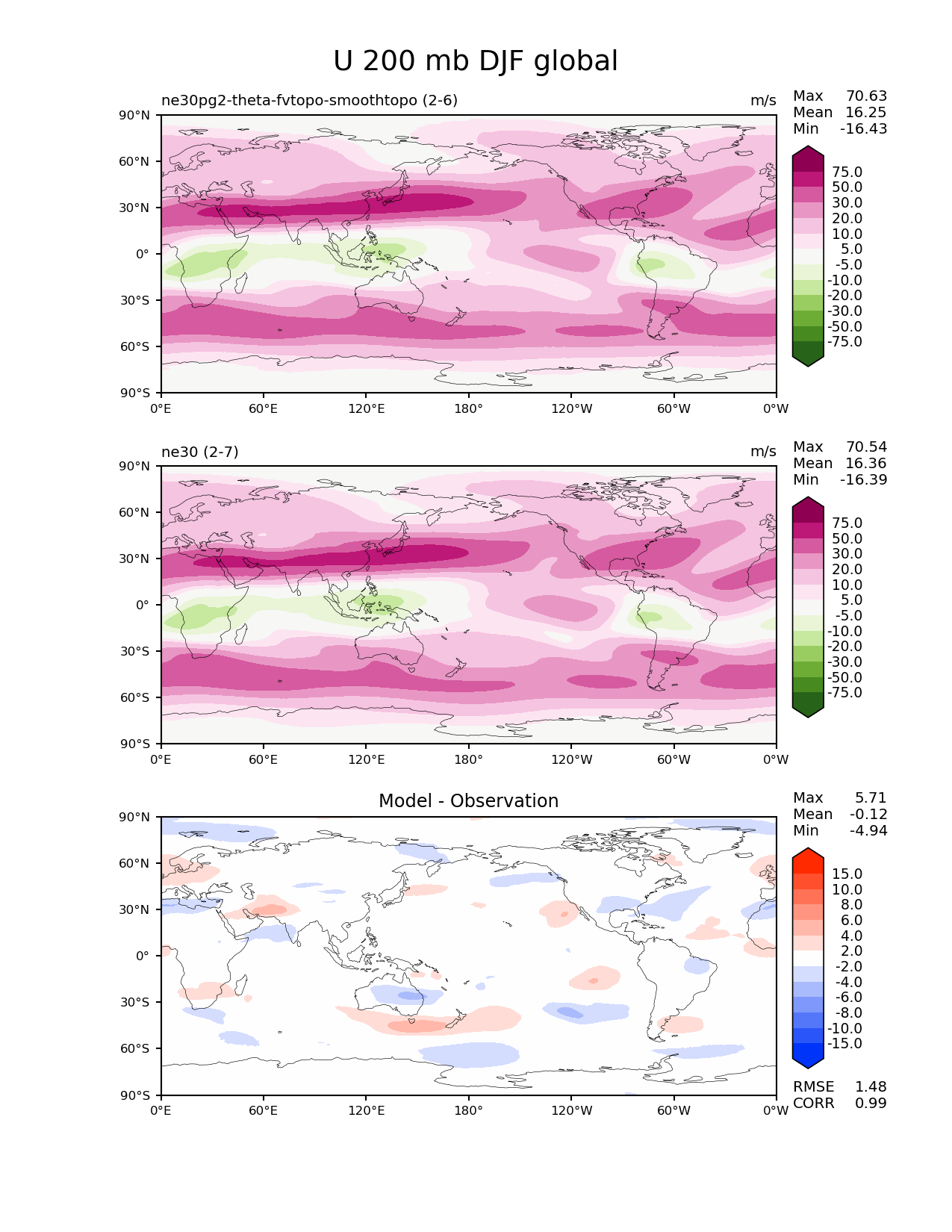 Use this command to recreate this image: | e3sm_diags --no_viewer --results_dir '/global/project/projectdirs/acme/www/ambrad/pg-ne30pg2-theta-fvtopo-smoothtopo' --variables 'U' --diff_colormap 'diverging_bwr.rgb' --contour_levels '-75' '-50' '-30' '-20' '-10' '-5' '5' '10' '20' '30' '50' '75' --diff_levels '-15' '-10' '-8' '-6' '-4' '-2' '2' '4' '6' '8' '10' '15' --backend 'mpl' --canvas_size_h '1628' --reference_colormap 'PiYG_r' --reference_data_path '/global/cscratch1/sd/ambradl/acme_scratch/cori-knl/diags1/ne30' --main_title 'U 200 mb DJF global' --test_data_path '/global/cscratch1/sd/ambradl/acme_scratch/cori-knl/diags1/ne30pg2-theta-fvtopo-smoothtopo' --regions 'global' --test_colormap 'PiYG_r' --regrid_method 'conservative' --figsize '8.5' '11.0' --canvas_size_w '1212' --run_type 'model_vs_model' --regrid_tool 'esmf' --num_workers '4' --reference_name 'ne30' --output_format 'png' --case_id 'model_vs_model' --granulate 'variables' 'seasons' 'regions' 'plevs' --test_name 'ne30pg2-theta-fvtopo-smoothtopo' --seasons 'DJF' --arrows --selectors 'sets' 'seasons' --diff_title 'Model - Observation' --sets 'lat_lon' --plevs '200.0' --dpi '150' |