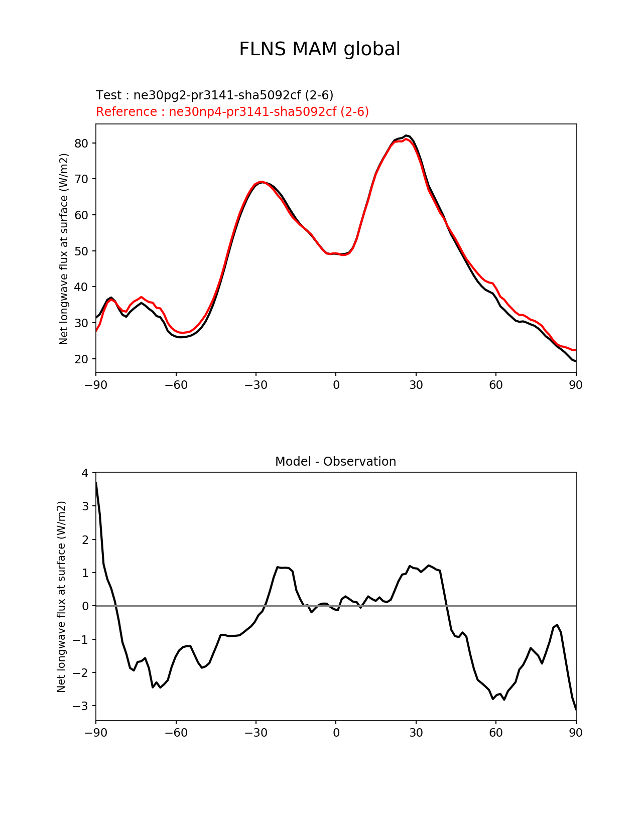 Use this command to recreate this image: | e3sm_diags --no_viewer --results_dir '/global/project/projectdirs/acme/www/ambrad/pg-ne30pg2-vs-ne30np4-pr3141-sha5092cf' --variables 'FLNS' --diff_colormap 'diverging_bwr.rgb' --test_colormap 'cet_rainbow.rgb' --backend 'mpl' --canvas_size_h '1628' --reference_colormap 'cet_rainbow.rgb' --reference_data_path '/global/cscratch1/sd/ambradl/acme_scratch/cori-knl/diags1/ne30np4-pr3141-sha5092cf' --main_title 'FLNS MAM global' --test_data_path '/global/cscratch1/sd/ambradl/acme_scratch/cori-knl/diags1/ne30pg2-pr3141-sha5092cf' --regions 'global' --regrid_method 'conservative' --figsize '8.5' '11.0' --canvas_size_w '1212' --run_type 'model_vs_model' --regrid_tool 'esmf' --num_workers '4' --reference_name 'ne30np4-pr3141-sha5092cf' --output_format 'png' --case_id 'model_vs_model' --granulate 'variables' 'seasons' 'regions' 'plevs' --test_name 'ne30pg2-pr3141-sha5092cf' --seasons 'MAM' --arrows --selectors 'sets' 'seasons' --diff_title 'Model - Observation' --sets 'zonal_mean_xy' --dpi '150' |