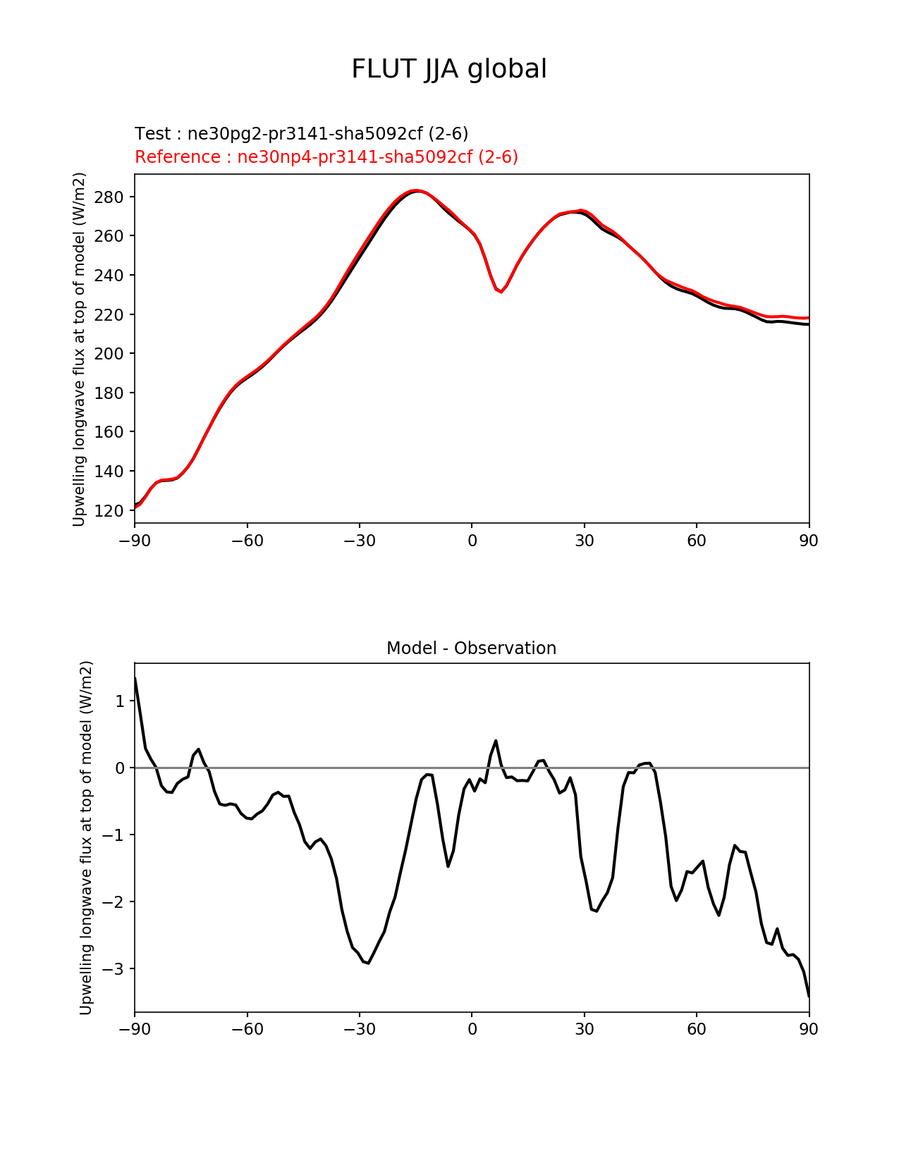 Use this command to recreate this image: | e3sm_diags --no_viewer --results_dir '/global/project/projectdirs/acme/www/ambrad/pg-ne30pg2-vs-ne30np4-pr3141-sha5092cf' --variables 'FLUT' --diff_colormap 'diverging_bwr.rgb' --test_colormap 'cet_rainbow.rgb' --backend 'mpl' --canvas_size_h '1628' --reference_colormap 'cet_rainbow.rgb' --reference_data_path '/global/cscratch1/sd/ambradl/acme_scratch/cori-knl/diags1/ne30np4-pr3141-sha5092cf' --main_title 'FLUT JJA global' --test_data_path '/global/cscratch1/sd/ambradl/acme_scratch/cori-knl/diags1/ne30pg2-pr3141-sha5092cf' --regions 'global' --regrid_method 'conservative' --figsize '8.5' '11.0' --canvas_size_w '1212' --run_type 'model_vs_model' --regrid_tool 'esmf' --num_workers '4' --reference_name 'ne30np4-pr3141-sha5092cf' --output_format 'png' --case_id 'model_vs_model' --granulate 'variables' 'seasons' 'regions' 'plevs' --test_name 'ne30pg2-pr3141-sha5092cf' --seasons 'JJA' --arrows --selectors 'sets' 'seasons' --diff_title 'Model - Observation' --sets 'zonal_mean_xy' --dpi '150' |