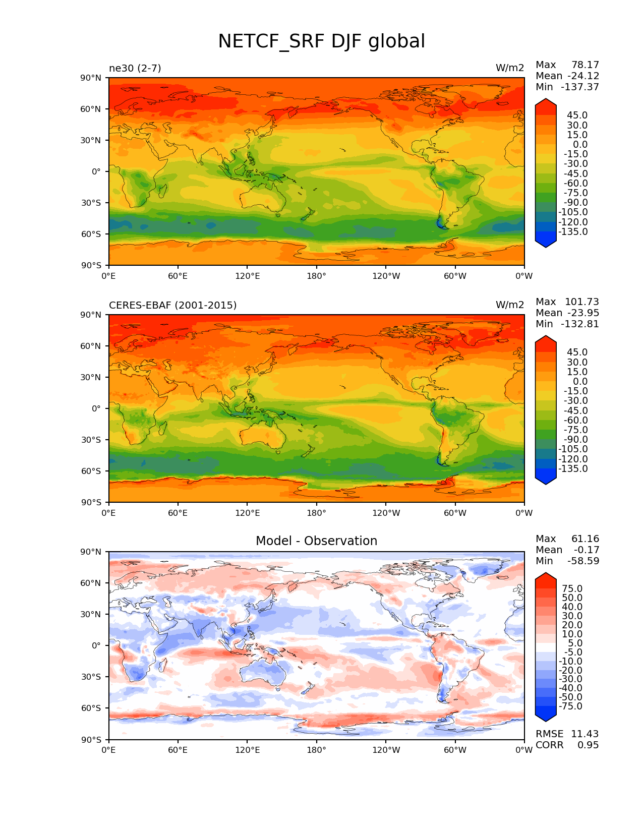Use this command to recreate this image: | e3sm_diags --no_viewer --results_dir '/global/project/projectdirs/acme/www/ambrad/pg-ne30vsobs' --variables 'NETCF_SRF' --contour_levels '-135' '-120' '-105' '-90' '-75' '-60' '-45' '-30' '-15' '0' '15' '30' '45' --diff_levels '-75' '-50' '-40' '-30' '-20' '-10' '-5' '5' '10' '20' '30' '40' '50' '75' --test_colormap 'cet_rainbow.rgb' --backend 'mpl' --canvas_size_h '1628' --reference_colormap 'cet_rainbow.rgb' --reference_data_path '/global/project/projectdirs/acme/acme_diags/obs_for_e3sm_diags/climatology/' --main_title 'NETCF_SRF DJF global' --test_data_path '/global/cscratch1/sd/ambradl/acme_scratch/cori-knl/diags1/ne30' --regions 'global' --case_id 'CERES-EBAF-surface-v4.0' --regrid_method 'conservative' --figsize '8.5' '11.0' --ref_name 'ceres_ebaf_surface_v4.0' --run_type 'model_vs_obs' --regrid_tool 'esmf' --num_workers '4' --reference_name 'CERES-EBAF' --output_format 'png' --diff_colormap 'diverging_bwr.rgb' --granulate 'variables' 'seasons' 'regions' 'plevs' --test_name 'ne30' --seasons 'DJF' --arrows --selectors 'sets' 'seasons' --diff_title 'Model - Observation' --sets 'lat_lon' --canvas_size_w '1212' --dpi '150' |