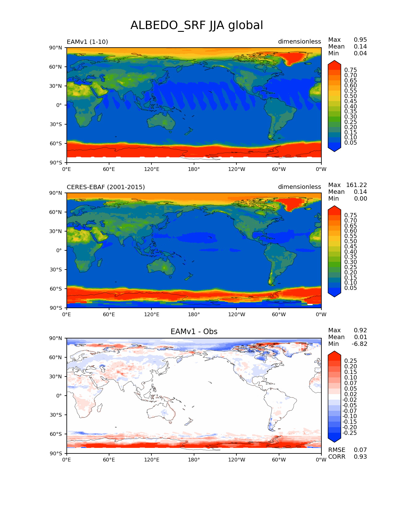 Use this command to recreate this image: | e3sm_diags --no_viewer --short_test_name 'EAMv1' --diff_colormap 'diverging_bwr.rgb' --contour_levels '0.05' '0.1' '0.15' '0.2' '0.25' '0.3' '0.35' '0.4' '0.45' '0.5' '0.55' '0.6' '0.65' '0.7' '0.75' --test_data_path '/global/cscratch1/sd/plma/people/for_bryce/climo/v1_f2000/' --diff_levels '-0.25' '-0.2' '-0.15' '-0.1' '-0.07' '-0.05' '-0.02' '0.02' '0.05' '0.07' '0.1' '0.15' '0.2' '0.25' --backend 'mpl' --canvas_size_h '1628' --reference_colormap 'cet_rainbow.rgb' --reference_data_path '/global/project/projectdirs/acme/acme_diags/obs_for_e3sm_diags/climatology/' --main_title 'ALBEDO_SRF JJA global' --results_dir '/global/cscratch1/sd/beharrop/people/for_polun/EAMv1/' --regions 'global' --test_colormap 'cet_rainbow.rgb' --regrid_method 'conservative' --variables 'ALBEDO_SRF' --figsize '8.5' '11.0' --ref_name 'ceres_ebaf_surface_v2.8' --run_type 'model_vs_obs' --regrid_tool 'esmf' --num_workers '64' --reference_name 'CERES-EBAF' --output_format 'png' --case_id 'CERES-EBAF-surface-v2.8' --granulate 'variables' 'seasons' 'regions' 'plevs' --test_name 'v1_f2000' --seasons 'JJA' --arrows --selectors 'sets' 'seasons' --diff_title 'EAMv1 - Obs' --sets 'lat_lon' --canvas_size_w '1212' --multiprocessing --dpi '150' |