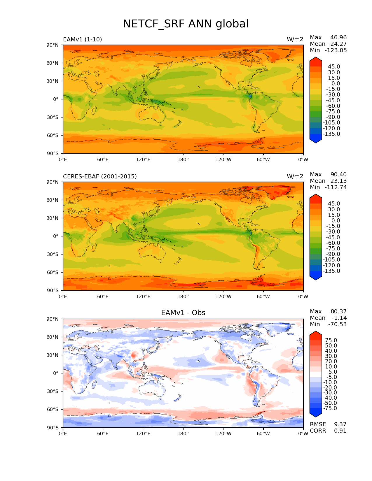 Use this command to recreate this image: | e3sm_diags --no_viewer --short_test_name 'EAMv1' --diff_colormap 'diverging_bwr.rgb' --contour_levels '-135' '-120' '-105' '-90' '-75' '-60' '-45' '-30' '-15' '0' '15' '30' '45' --test_data_path '/global/cscratch1/sd/plma/people/for_bryce/climo/v1_f2000/' --diff_levels '-75' '-50' '-40' '-30' '-20' '-10' '-5' '5' '10' '20' '30' '40' '50' '75' --backend 'mpl' --canvas_size_h '1628' --reference_colormap 'cet_rainbow.rgb' --reference_data_path '/global/project/projectdirs/acme/acme_diags/obs_for_e3sm_diags/climatology/' --main_title 'NETCF_SRF ANN global' --results_dir '/global/cscratch1/sd/beharrop/people/for_polun/EAMv1/' --regions 'global' --test_colormap 'cet_rainbow.rgb' --regrid_method 'conservative' --variables 'NETCF_SRF' --figsize '8.5' '11.0' --ref_name 'ceres_ebaf_surface_v2.8' --run_type 'model_vs_obs' --regrid_tool 'esmf' --num_workers '64' --reference_name 'CERES-EBAF' --output_format 'png' --case_id 'CERES-EBAF-surface-v2.8' --granulate 'variables' 'seasons' 'regions' 'plevs' --test_name 'v1_f2000' --seasons 'ANN' --arrows --selectors 'sets' 'seasons' --diff_title 'EAMv1 - Obs' --sets 'lat_lon' --canvas_size_w '1212' --multiprocessing --dpi '150' |