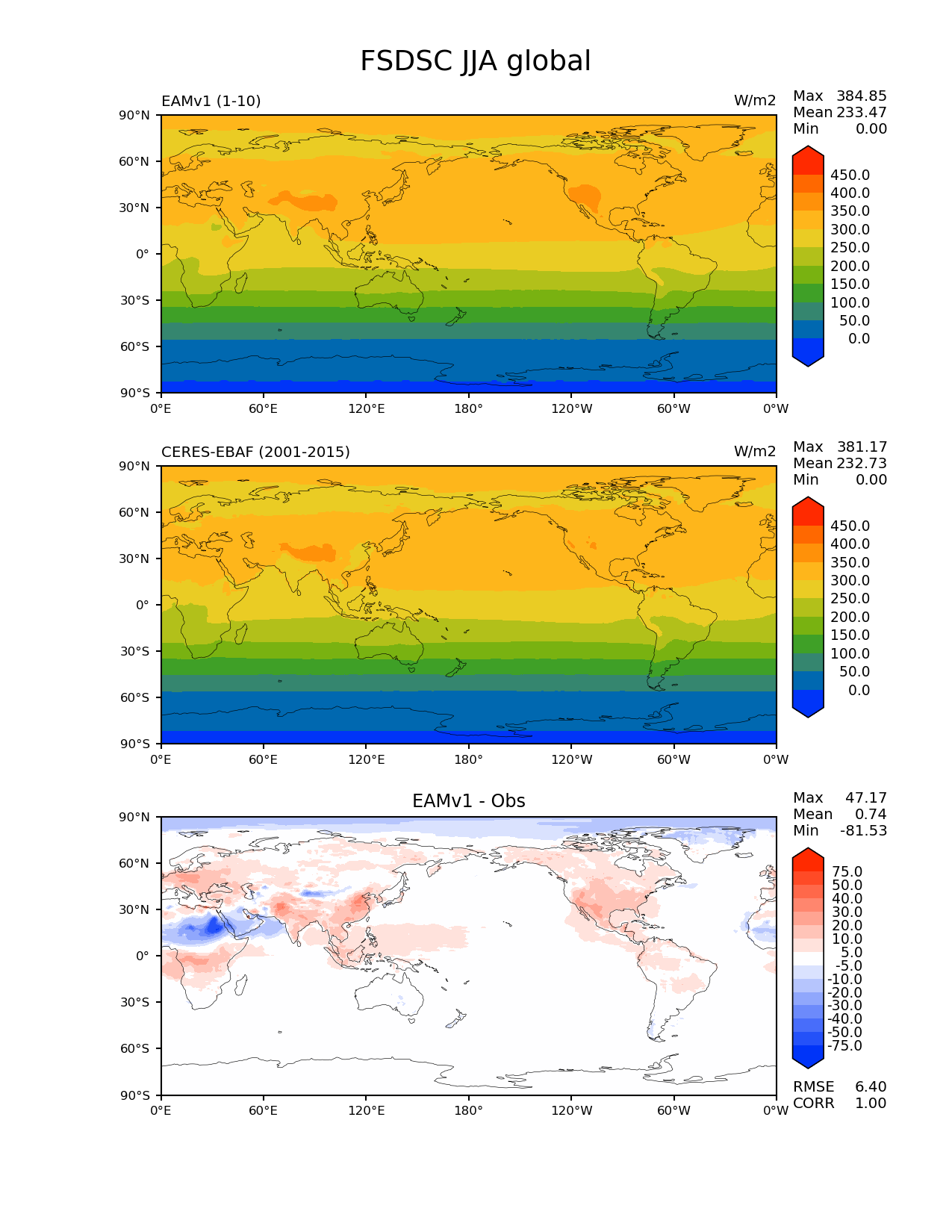 Use this command to recreate this image: | e3sm_diags --no_viewer --short_test_name 'EAMv1' --diff_colormap 'diverging_bwr.rgb' --contour_levels '0' '50' '100' '150' '200' '250' '300' '350' '400' '450' --test_data_path '/global/cscratch1/sd/plma/people/for_bryce/climo/v1_f2000/' --diff_levels '-75' '-50' '-40' '-30' '-20' '-10' '-5' '5' '10' '20' '30' '40' '50' '75' --backend 'mpl' --canvas_size_h '1628' --reference_colormap 'cet_rainbow.rgb' --reference_data_path '/global/project/projectdirs/acme/acme_diags/obs_for_e3sm_diags/climatology/' --main_title 'FSDSC JJA global' --results_dir '/global/cscratch1/sd/beharrop/people/for_polun/EAMv1/' --regions 'global' --test_colormap 'cet_rainbow.rgb' --regrid_method 'conservative' --variables 'FSDSC' --figsize '8.5' '11.0' --ref_name 'ceres_ebaf_surface_v4.0' --run_type 'model_vs_obs' --regrid_tool 'esmf' --num_workers '64' --reference_name 'CERES-EBAF' --output_format 'png' --case_id 'CERES-EBAF-surface-v4.0' --granulate 'variables' 'seasons' 'regions' 'plevs' --test_name 'v1_f2000' --seasons 'JJA' --arrows --selectors 'sets' 'seasons' --diff_title 'EAMv1 - Obs' --sets 'lat_lon' --canvas_size_w '1212' --multiprocessing --dpi '150' |