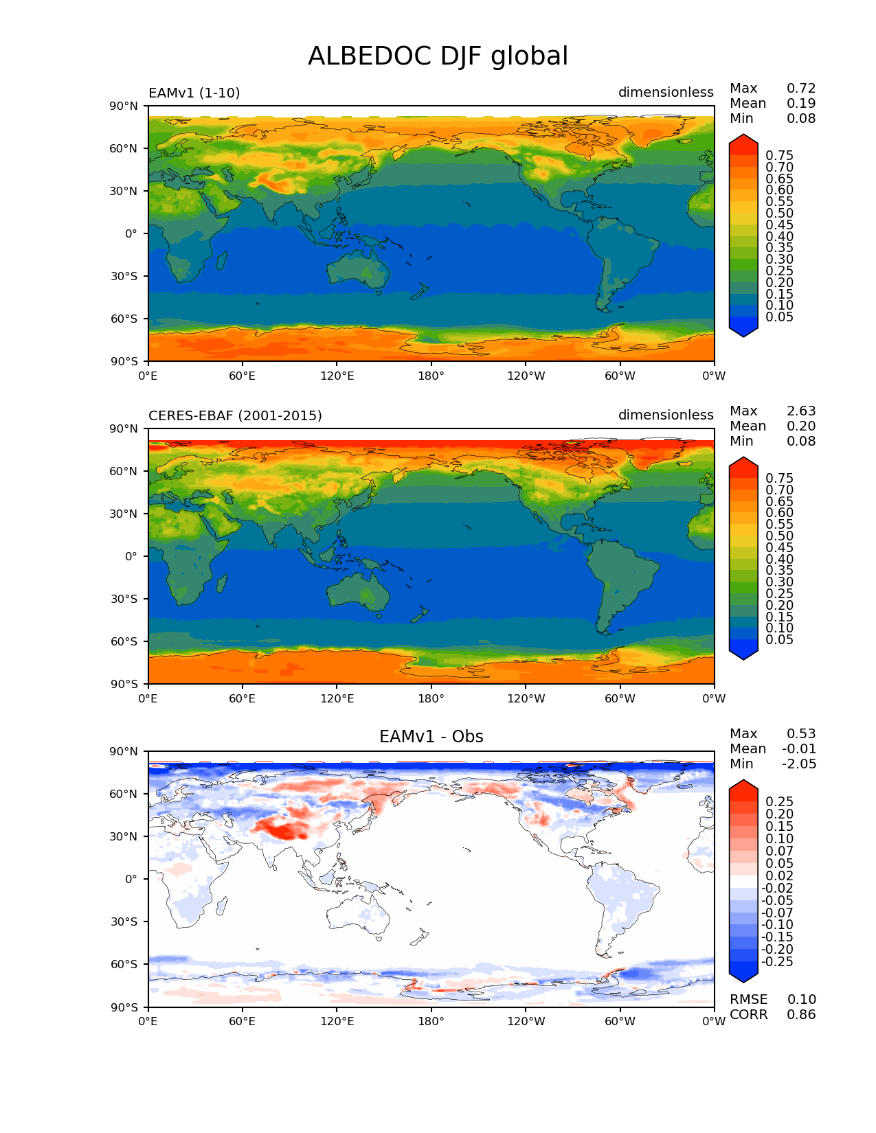 Use this command to recreate this image: | e3sm_diags --no_viewer --short_test_name 'EAMv1' --diff_colormap 'diverging_bwr.rgb' --contour_levels '0.05' '0.1' '0.15' '0.2' '0.25' '0.3' '0.35' '0.4' '0.45' '0.5' '0.55' '0.6' '0.65' '0.7' '0.75' --test_data_path '/global/cscratch1/sd/plma/people/for_bryce/climo/v1_f2000/' --diff_levels '-0.25' '-0.2' '-0.15' '-0.1' '-0.07' '-0.05' '-0.02' '0.02' '0.05' '0.07' '0.1' '0.15' '0.2' '0.25' --backend 'mpl' --canvas_size_h '1628' --reference_colormap 'cet_rainbow.rgb' --reference_data_path '/global/project/projectdirs/acme/acme_diags/obs_for_e3sm_diags/climatology/' --main_title 'ALBEDOC DJF global' --results_dir '/global/cscratch1/sd/beharrop/people/for_polun/EAMv1/' --regions 'global' --test_colormap 'cet_rainbow.rgb' --regrid_method 'conservative' --variables 'ALBEDOC' --figsize '8.5' '11.0' --ref_name 'ceres_ebaf_toa_v2.8' --run_type 'model_vs_obs' --regrid_tool 'esmf' --num_workers '64' --reference_name 'CERES-EBAF' --output_format 'png' --case_id 'CERES-EBAF-TOA-v2.8' --granulate 'variables' 'seasons' 'regions' 'plevs' --test_name 'v1_f2000' --seasons 'DJF' --arrows --selectors 'sets' 'seasons' --diff_title 'EAMv1 - Obs' --sets 'lat_lon' --canvas_size_w '1212' --multiprocessing --dpi '150' |