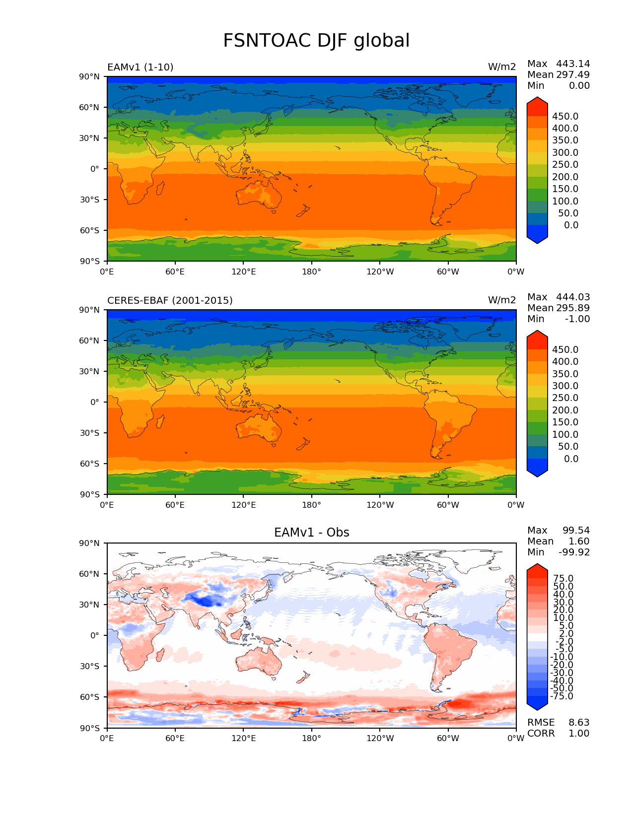 Use this command to recreate this image: | e3sm_diags --no_viewer --short_test_name 'EAMv1' --diff_colormap 'diverging_bwr.rgb' --contour_levels '0' '50' '100' '150' '200' '250' '300' '350' '400' '450' --test_data_path '/global/cscratch1/sd/plma/people/for_bryce/climo/v1_f2000/' --diff_levels '-75' '-50' '-40' '-30' '-20' '-10' '-5' '-2' '2' '5' '10' '20' '30' '40' '50' '75' --backend 'mpl' --canvas_size_h '1628' --reference_colormap 'cet_rainbow.rgb' --reference_data_path '/global/project/projectdirs/acme/acme_diags/obs_for_e3sm_diags/climatology/' --main_title 'FSNTOAC DJF global' --results_dir '/global/cscratch1/sd/beharrop/people/for_polun/EAMv1/' --regions 'global' --test_colormap 'cet_rainbow.rgb' --regrid_method 'conservative' --variables 'FSNTOAC' --figsize '8.5' '11.0' --ref_name 'ceres_ebaf_toa_v2.8' --run_type 'model_vs_obs' --regrid_tool 'esmf' --num_workers '64' --reference_name 'CERES-EBAF' --output_format 'png' --case_id 'CERES-EBAF-TOA-v2.8' --granulate 'variables' 'seasons' 'regions' 'plevs' --test_name 'v1_f2000' --seasons 'DJF' --arrows --selectors 'sets' 'seasons' --diff_title 'EAMv1 - Obs' --sets 'lat_lon' --canvas_size_w '1212' --multiprocessing --dpi '150' |