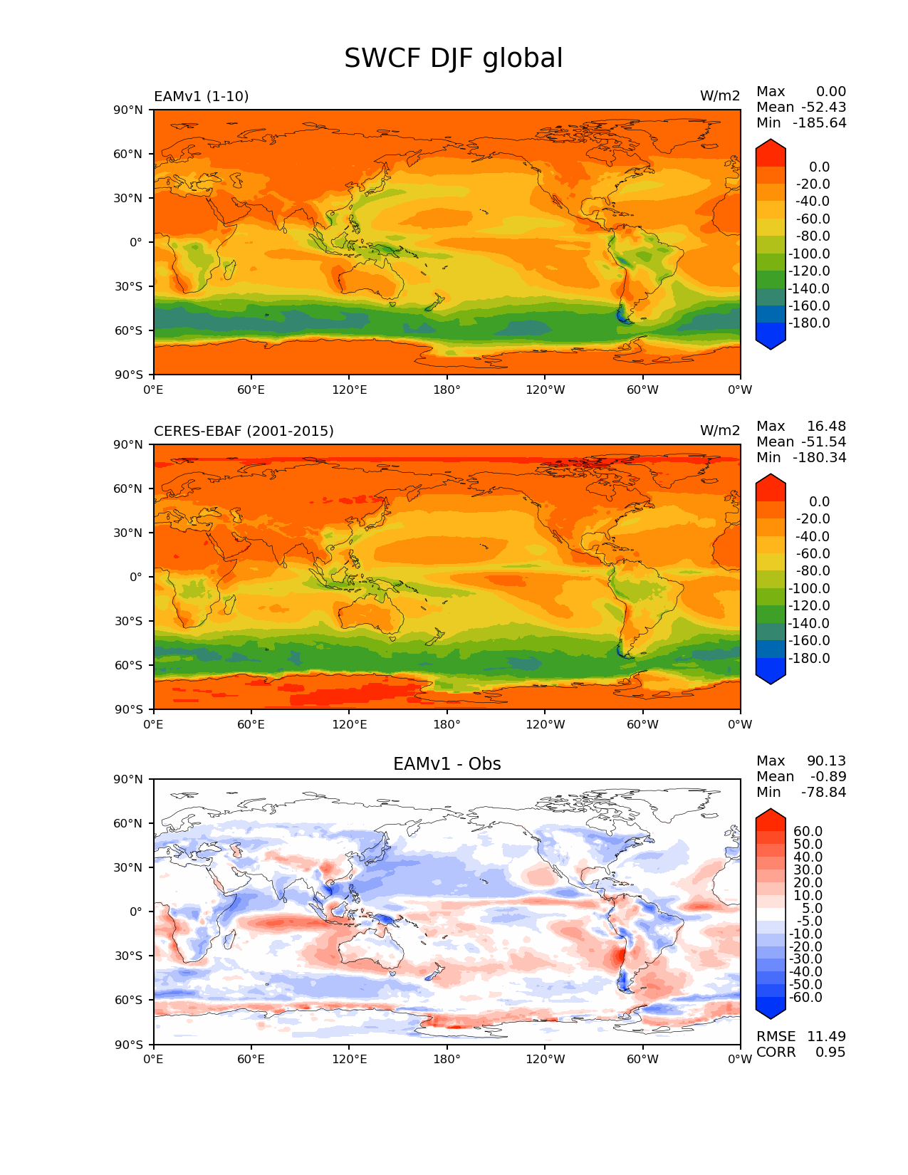 Use this command to recreate this image: | e3sm_diags --no_viewer --variables 'SWCF' --diff_colormap 'diverging_bwr.rgb' --contour_levels '-180' '-160' '-140' '-120' '-100' '-80' '-60' '-40' '-20' '0' --test_data_path '/global/cscratch1/sd/plma/people/for_bryce/climo/v1_f2000/' --diff_levels '-60' '-50' '-40' '-30' '-20' '-10' '-5' '5' '10' '20' '30' '40' '50' '60' --backend 'mpl' --canvas_size_h '1628' --reference_colormap 'cet_rainbow.rgb' --reference_data_path '/global/project/projectdirs/acme/acme_diags/obs_for_e3sm_diags/climatology/' --main_title 'SWCF DJF global' --results_dir '/global/cscratch1/sd/beharrop/people/for_polun/EAMv1/' --regions 'global' --test_colormap 'cet_rainbow.rgb' --regrid_method 'conservative' --short_test_name 'EAMv1' --figsize '8.5' '11.0' --ref_name 'ceres_ebaf_toa_v2.8' --run_type 'model_vs_obs' --regrid_tool 'esmf' --num_workers '64' --reference_name 'CERES-EBAF' --output_format 'png' --case_id 'CERES-EBAF-TOA-v2.8' --granulate 'variables' 'seasons' 'regions' 'plevs' --test_name 'v1_f2000' --seasons 'DJF' --arrows --selectors 'sets' 'seasons' --diff_title 'EAMv1 - Obs' --sets 'lat_lon' --canvas_size_w '1212' --multiprocessing --dpi '150' |